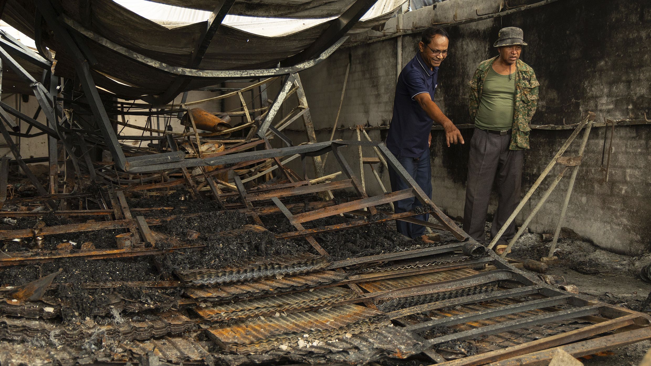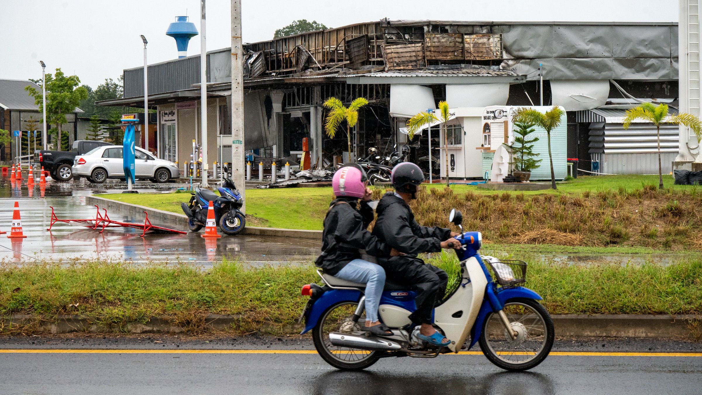 Local people drive past the burned out convenience store in Ban Phue, Sisaket province, Thailand on July 27. (Photo by Adryel Talamantes)