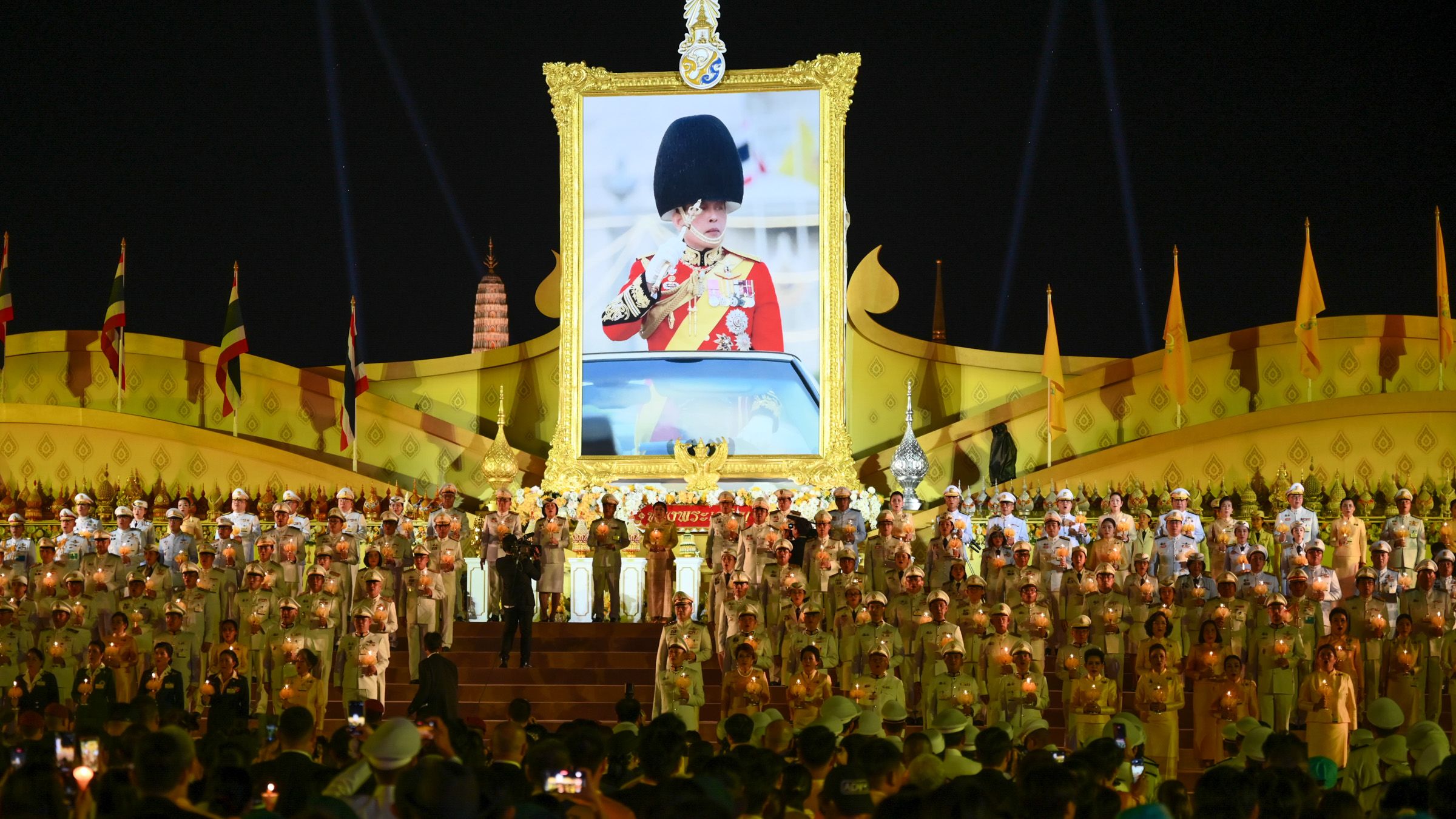 People gather at Sanam Luang in Bangkok next to the Grand Palace to celebrate Thai King Maha Vajiralongkorn's birthday on July 28, after an announcement of a ceasefire. (Photo by Suzu Takahashi)