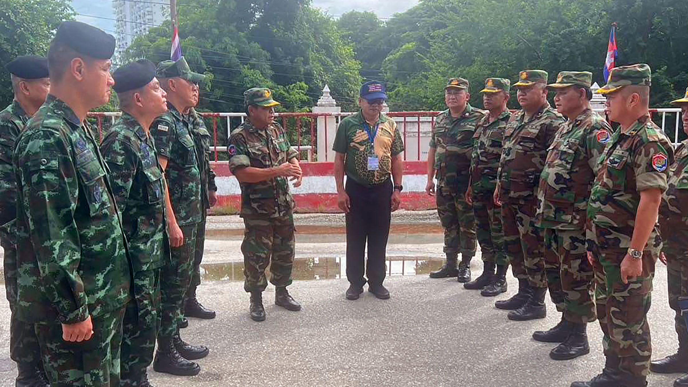 Officers from the Royal Thai Army, left, meet with their counterparts from the Royal Cambodian Army in no man's land near the Aranyaprathet-Poipet border crossing between Thailand's Sa Kaeo province and Cambodia's Banteay Meanchey province, on July 29. (Photo by Royal Thai Army/AFP/Jiji)