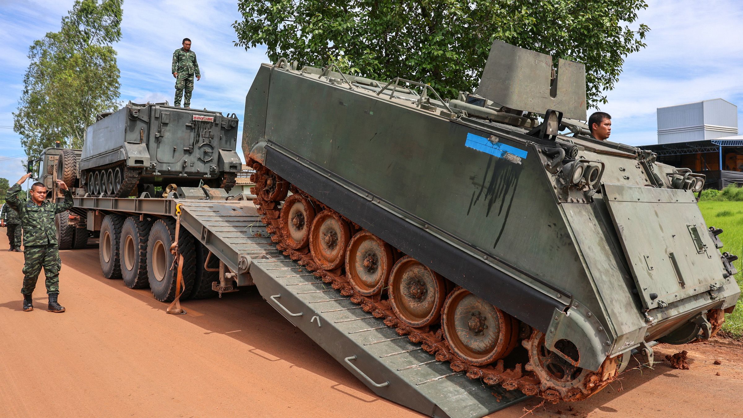 A truck carries armored personnel carriers on a road near the Thai-Cambodian border in Sisaket province, Thailand, on July 29. (Photo by Athit Perawongmetha/Reuters)