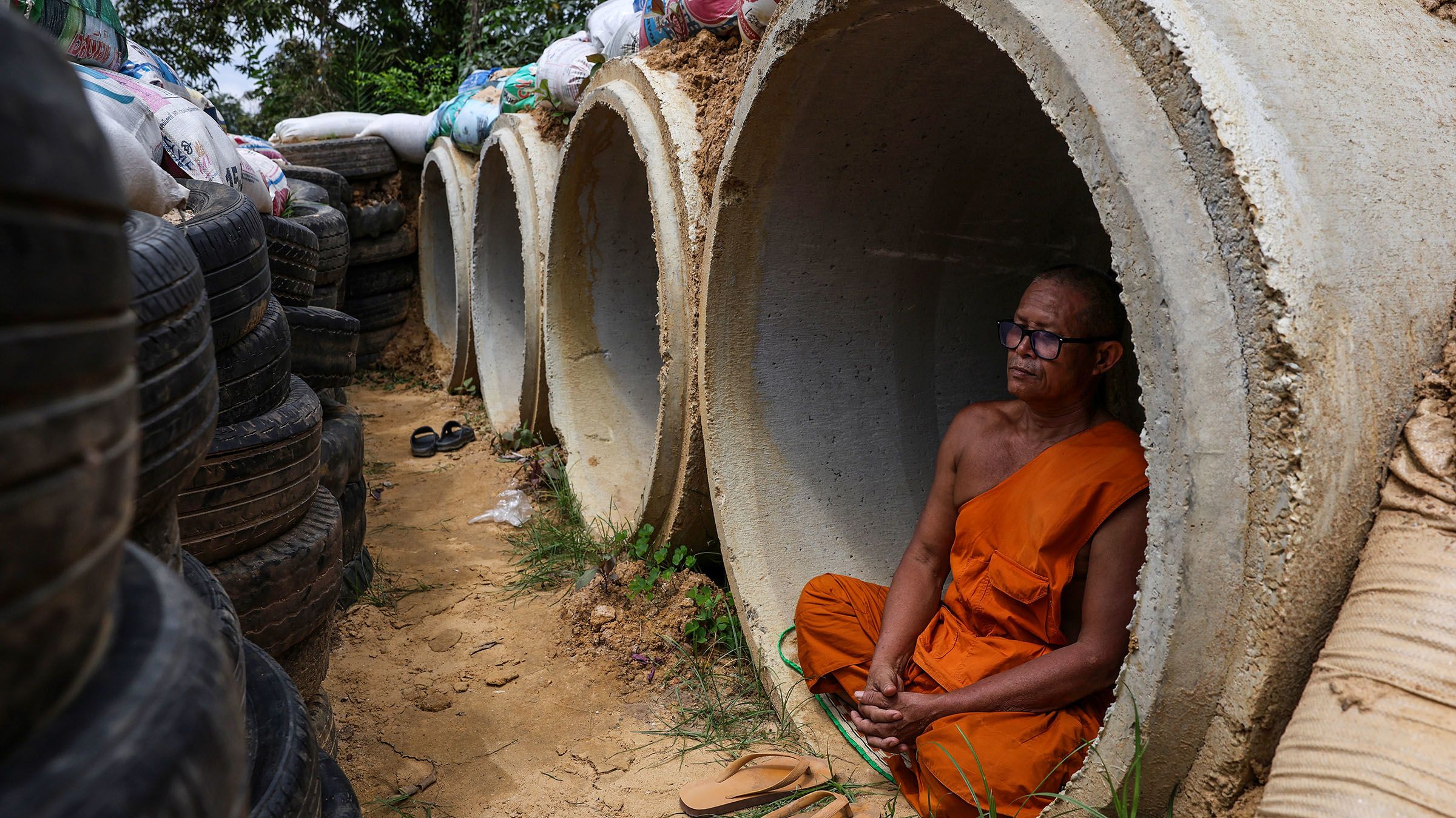 A monk sits in a makeshift bomb shelter in Surin province, Thailand, on July 25. (Photo by Valeria Mongelli/Getty Images)