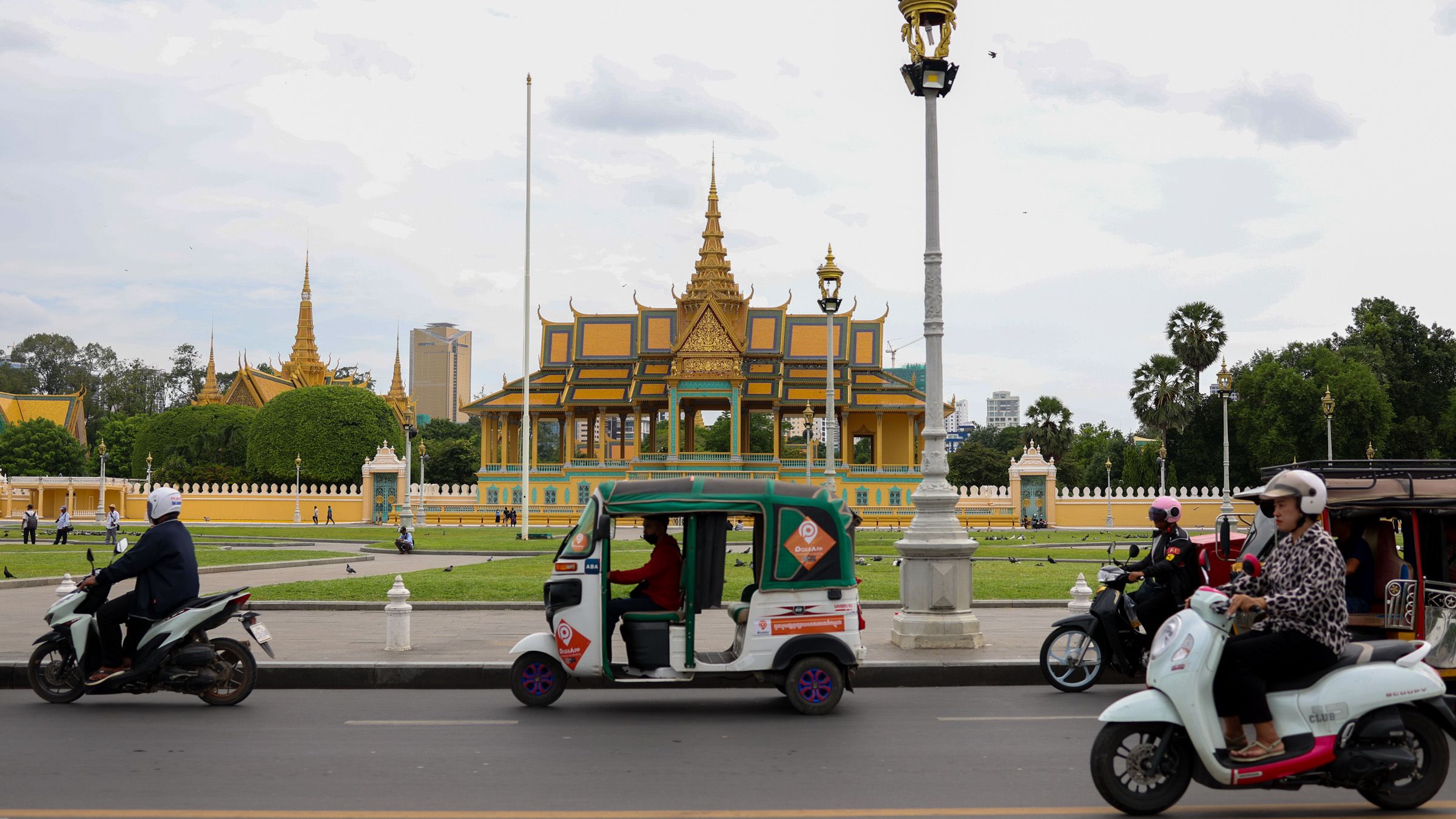 People drive past Royal Palace of Cambodia in the capital of Phnom Penh on July 25, as the Thailand-Cambodia border conflict entered its second day. (Photo by Daniel Ceng/Getty Images)