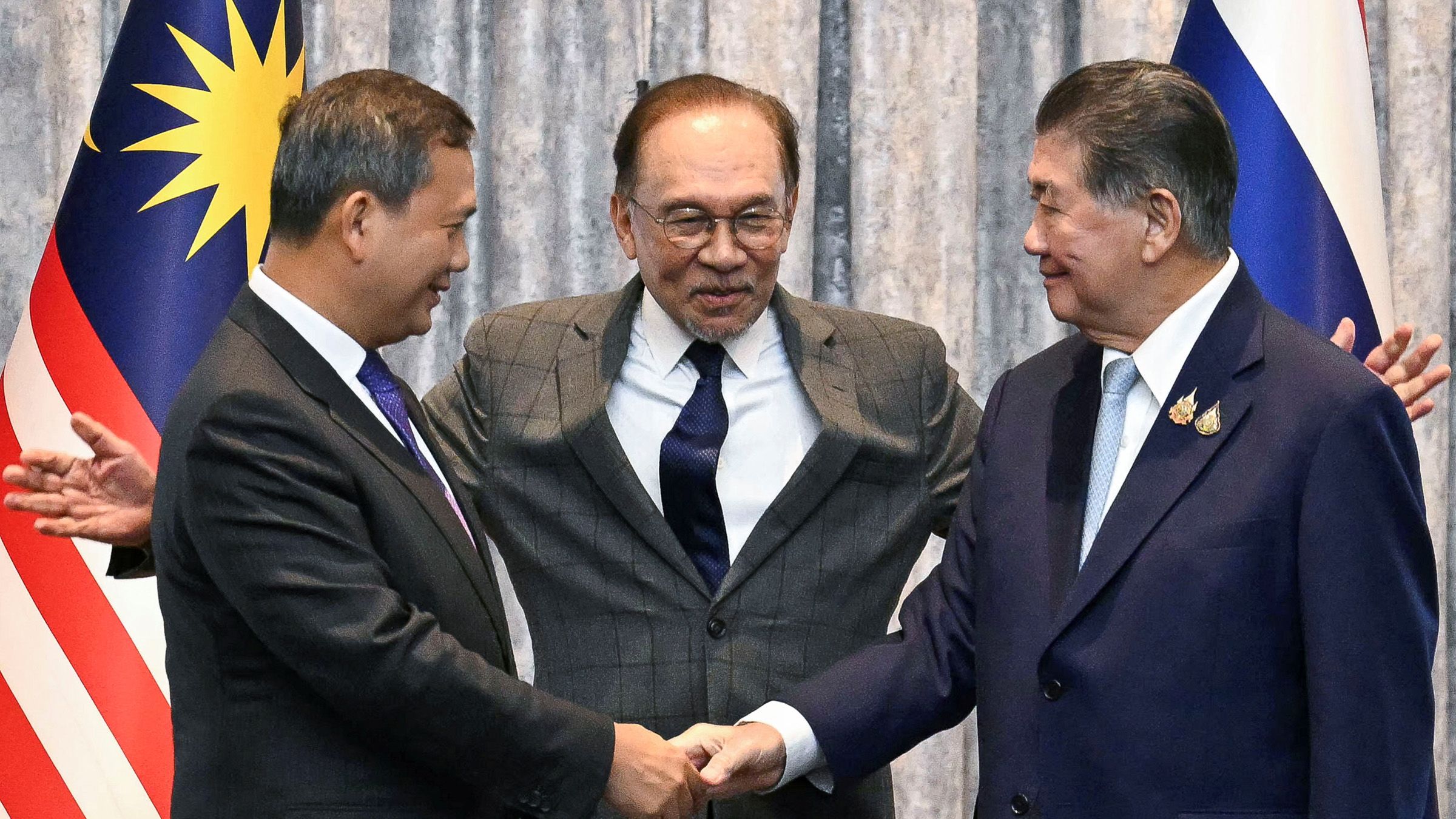 Malaysian Prime Minister Anwar Ibrahim, center, looks on as Cambodian Prime Minister Hun Manet, left, and Thailand's acting Prime Minister Phumtham Wechayachai shake hands following a press conference on the day of mediation talks on the Thailand-Cambodia border conflict, in Putrajaya, Malaysia, on July 28. (Photo by Mohd Rasfan/Pool/Reuters)