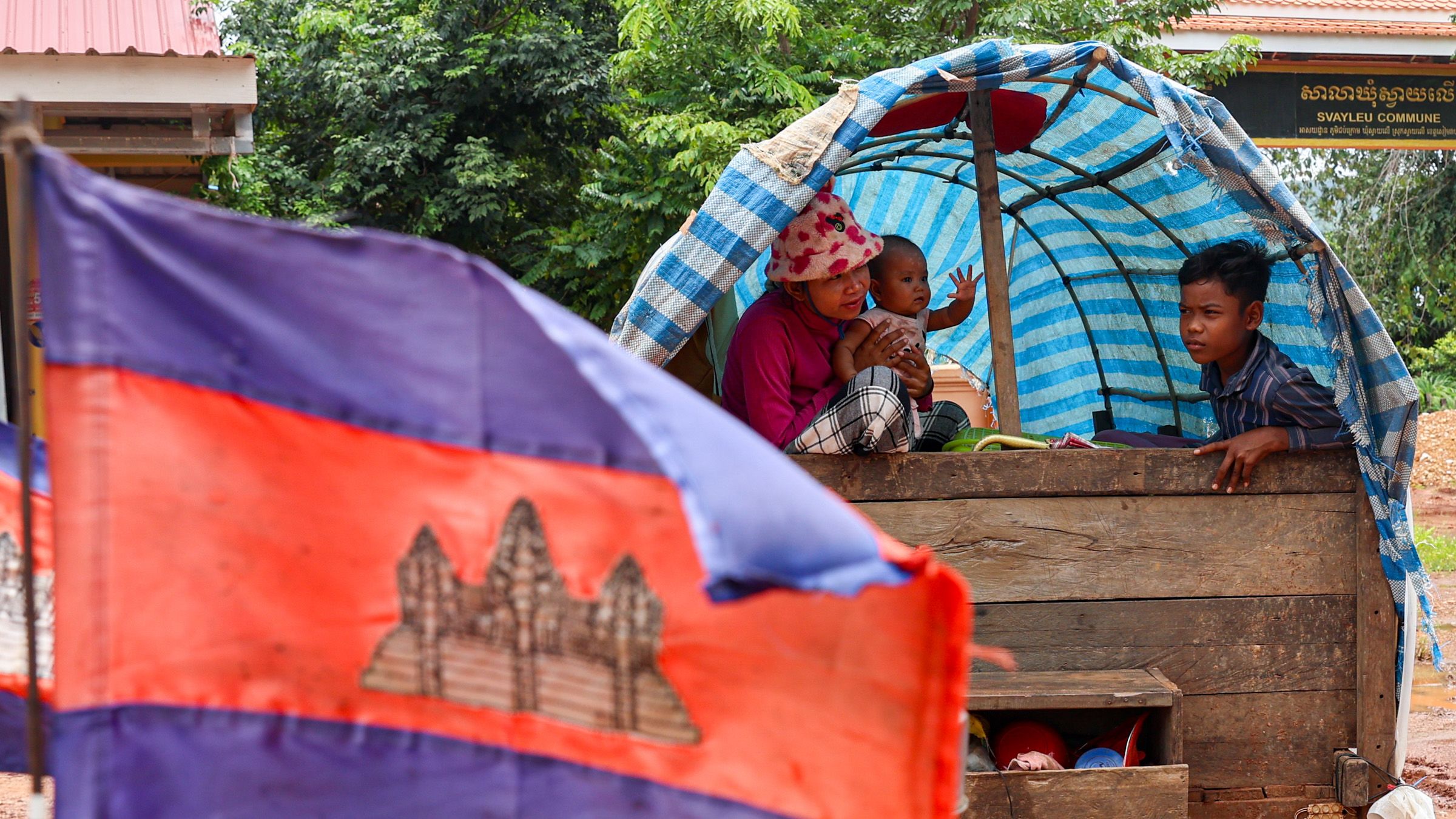 Cambodian families fleeing the border conflict head to a Buddhist temple that was being used as a shelter in Preah Vihear province, Cambodia, on July 26. (Photo by Daniel Ceng/Getty Images)