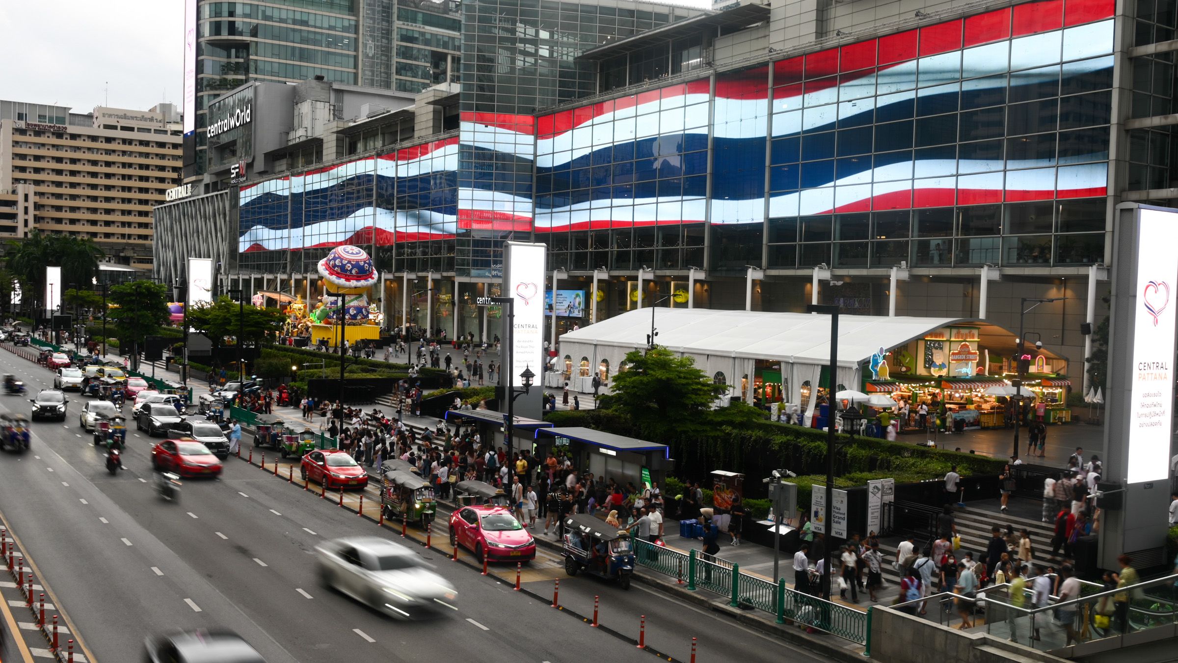 The CentralWorld shopping center in Bangkok displays the Thai national flag on July 27. (Photo by Suzu Takahashi)