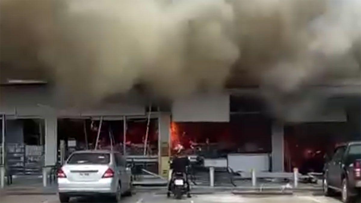 This screenshot from the Royal Thai Army's Facebook page shows a gas station in Srisaket province, Thailand, that was hit by a rocket fired from Cambodia.