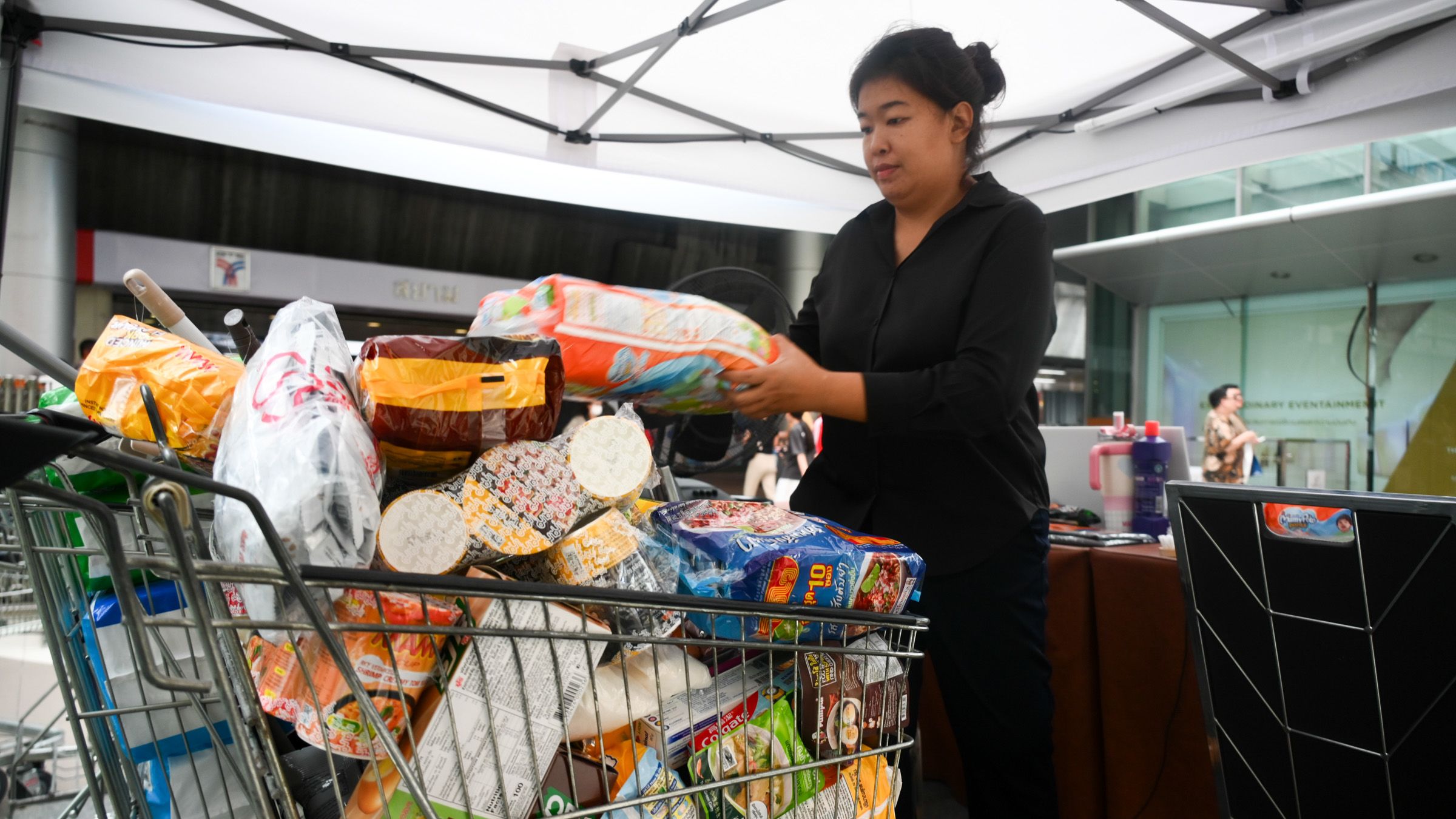 A woman sorts supplies at a donation booth outside of a mall in Bangkok on July 27. (Photo by Suzu Takahashi)