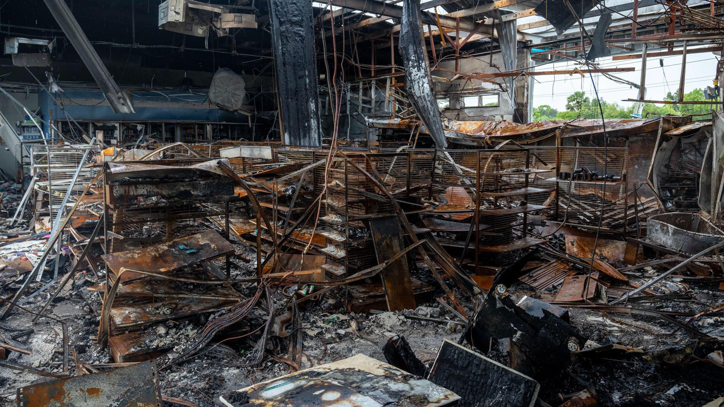 The bombed and burned out interior of the convenience store in Ban Phue, Sisaket Province on July 27. (Photo by Adryel Talamantes)