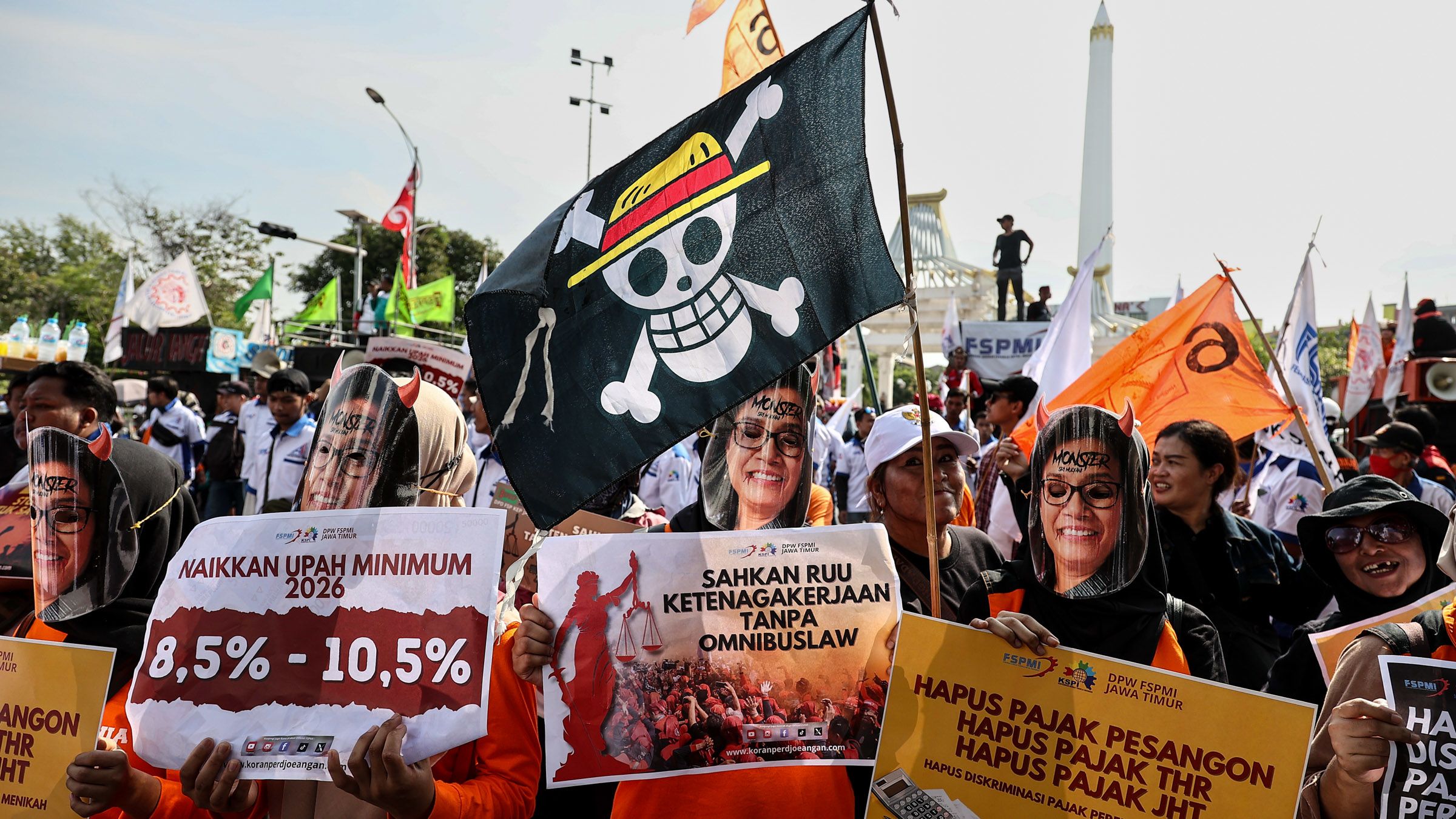 Laborers display posters – and one flies a “One Piece” Jolly Roger flag – during an anti-government protest in Surabaya. The Japanese manga’s main characters fight corrupt authorities, a theme that appears to be resonating with Indonesia’s protesters. (Photo by Robertus Pudyanto/Getty Images)