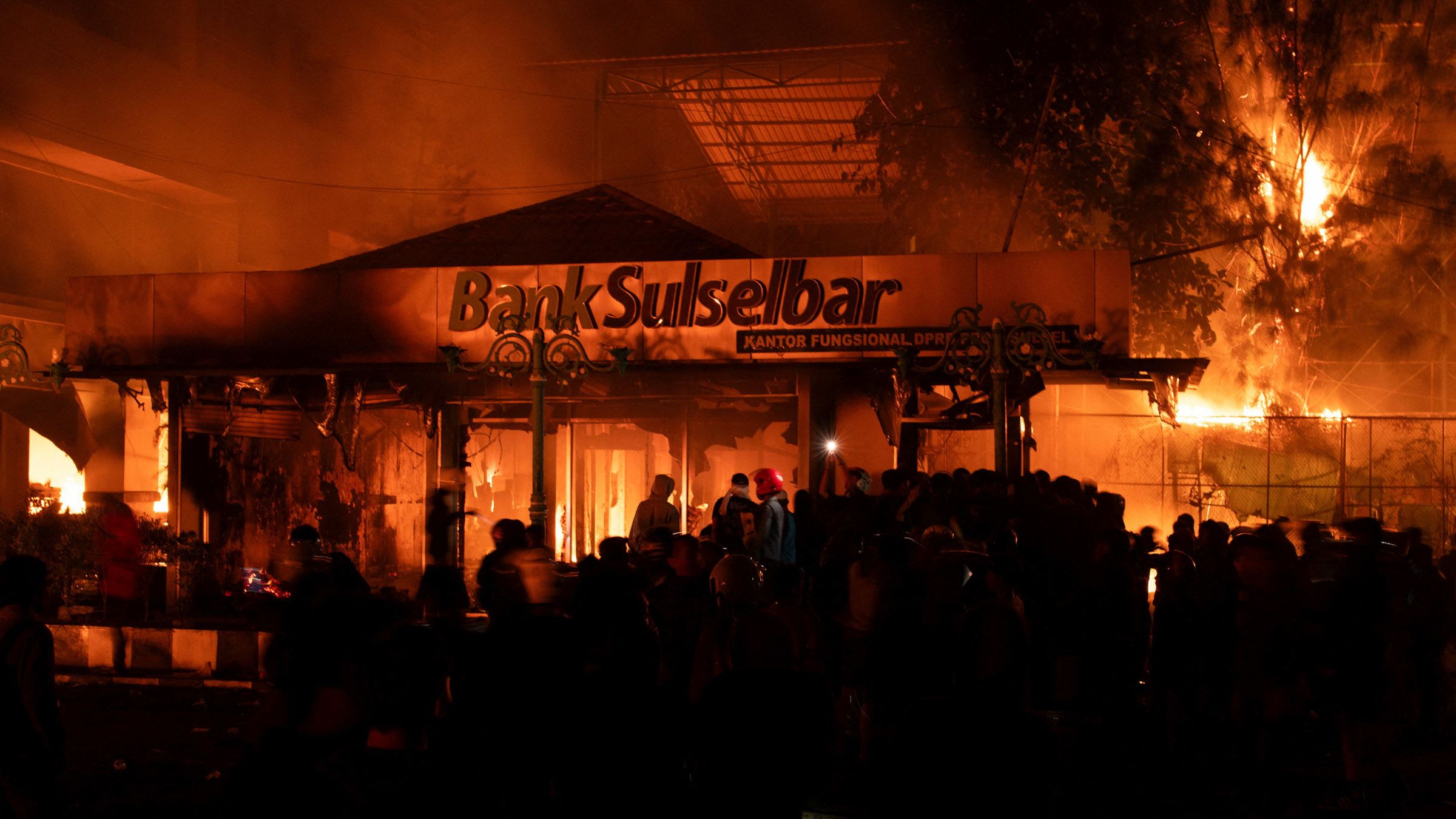 On Aug. 30, protesters gather near a burning building on the grounds of the regional parliament in Makassar, South Sulawesi province. (Photo by Iqbal Lubis/Reuters)