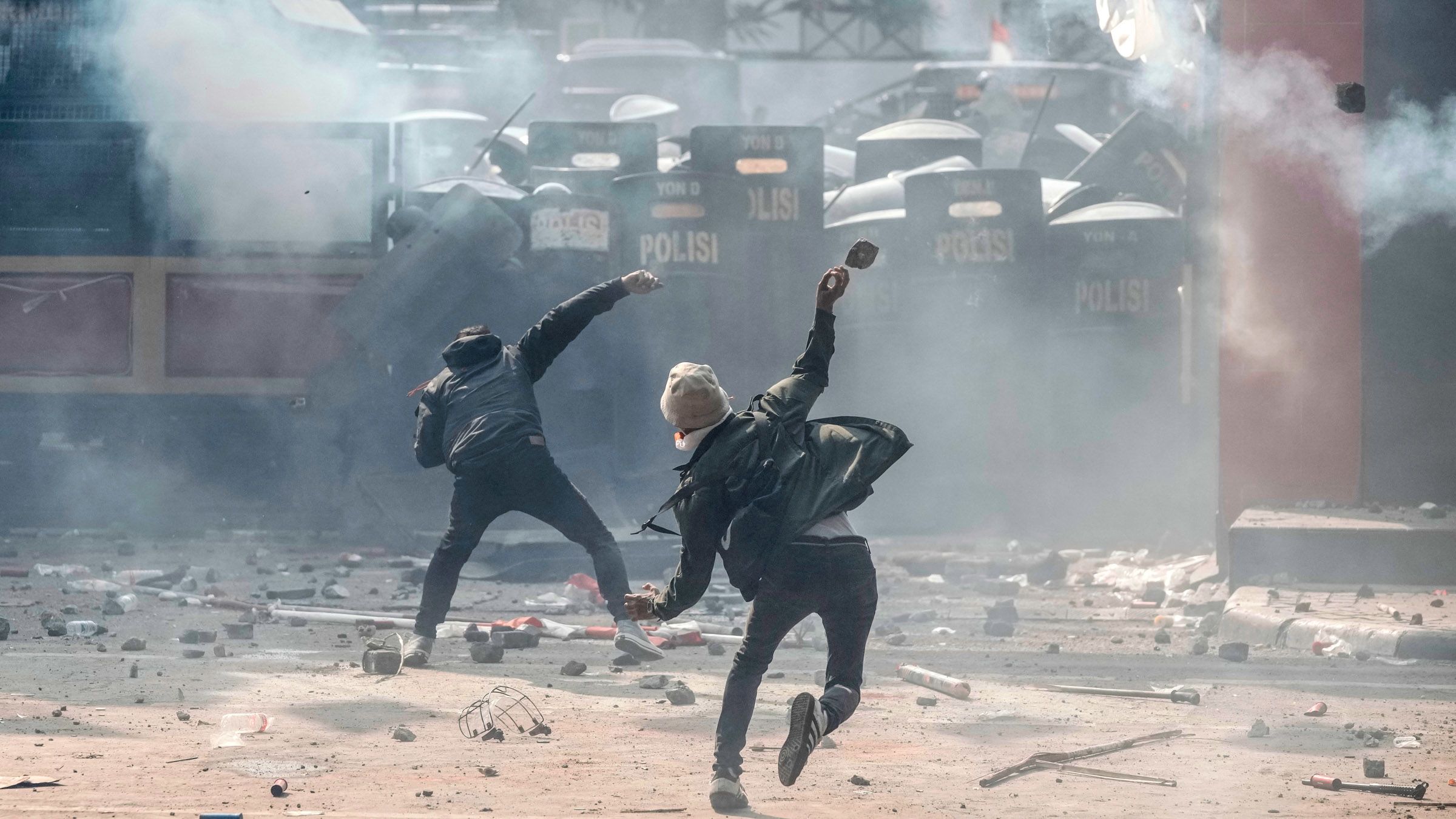 Following the death of the motorcycle taxi driver, protesters throw stones at riot police in Jakarta. (Photo by Achmad Ibrahim/AP)