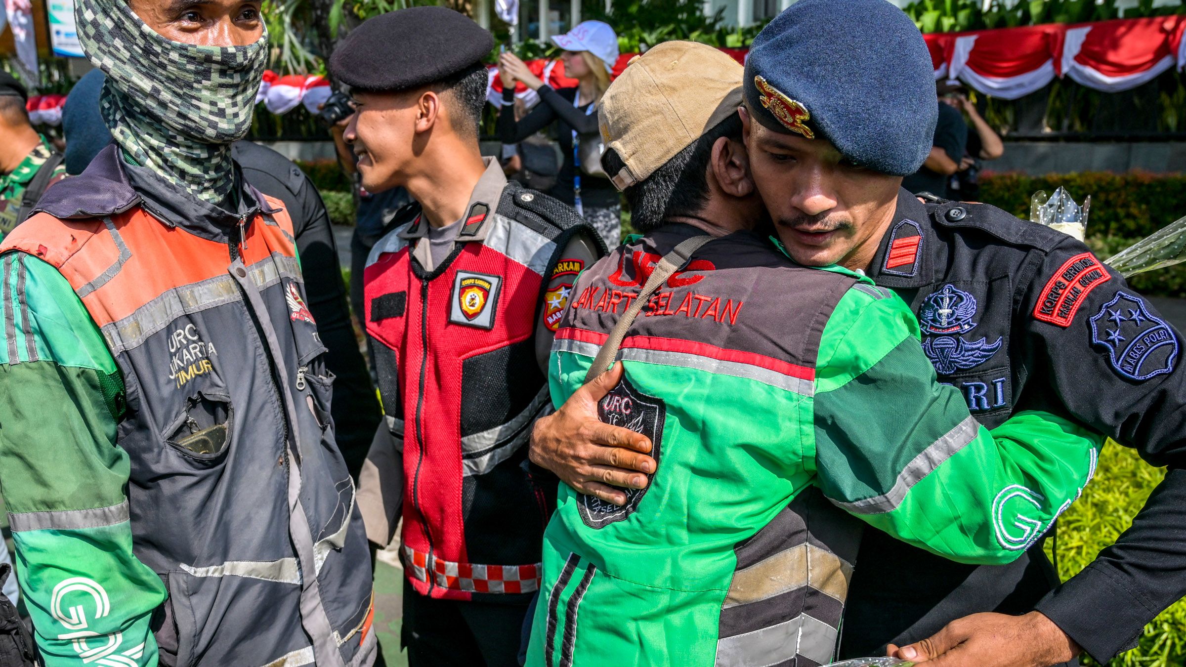 A motorcycle taxi driver and police officer hug each other during a peace rally in Jakarta. (Photo by Bay Ismoyo/AFP/Jiji)