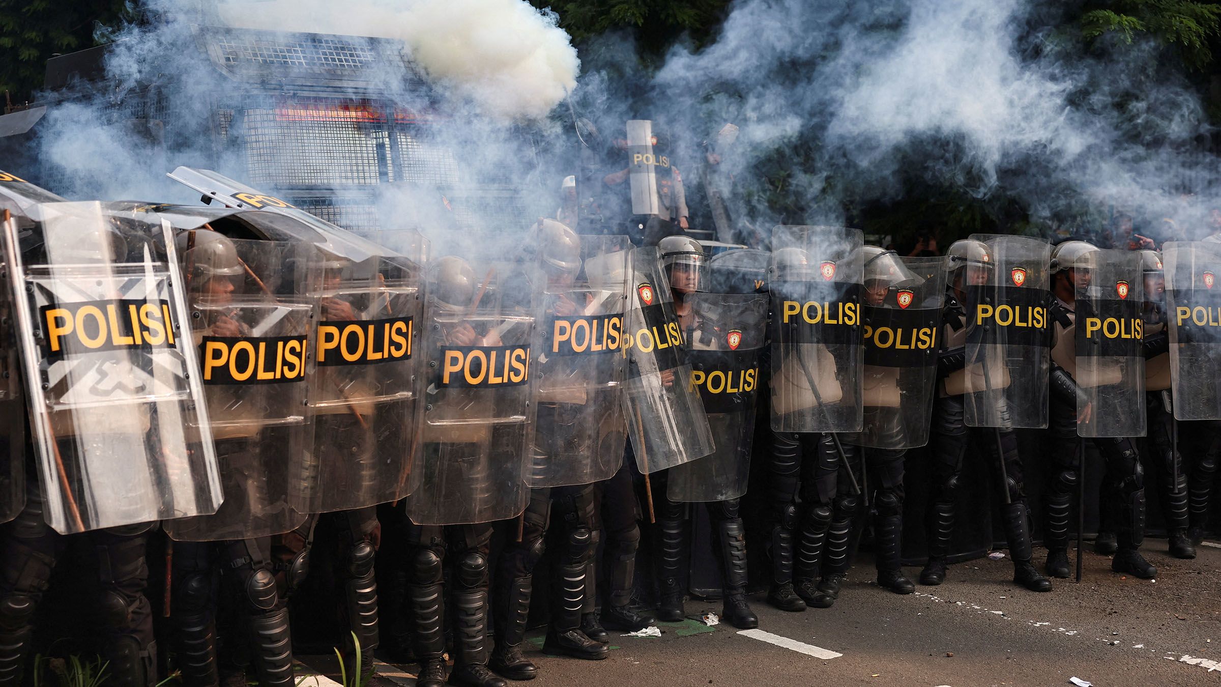 On Aug. 25, riot police form a wall against demonstrators angry at exorbitant allowances for lawmakers, outside Indonesia’s parliament, in Jakarta. (Photo by Willy Kurniawan/Reuters)