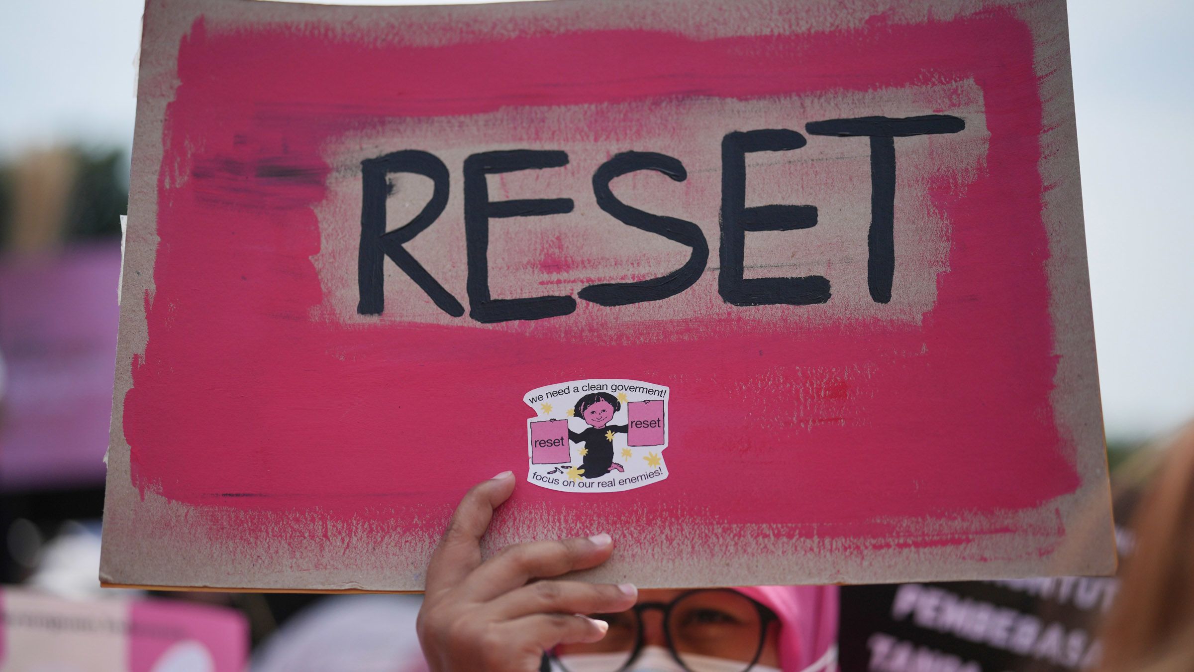 An activist holds a pink poster during a rally in Jakarta. (Photo by Dita Alangkara/AP)