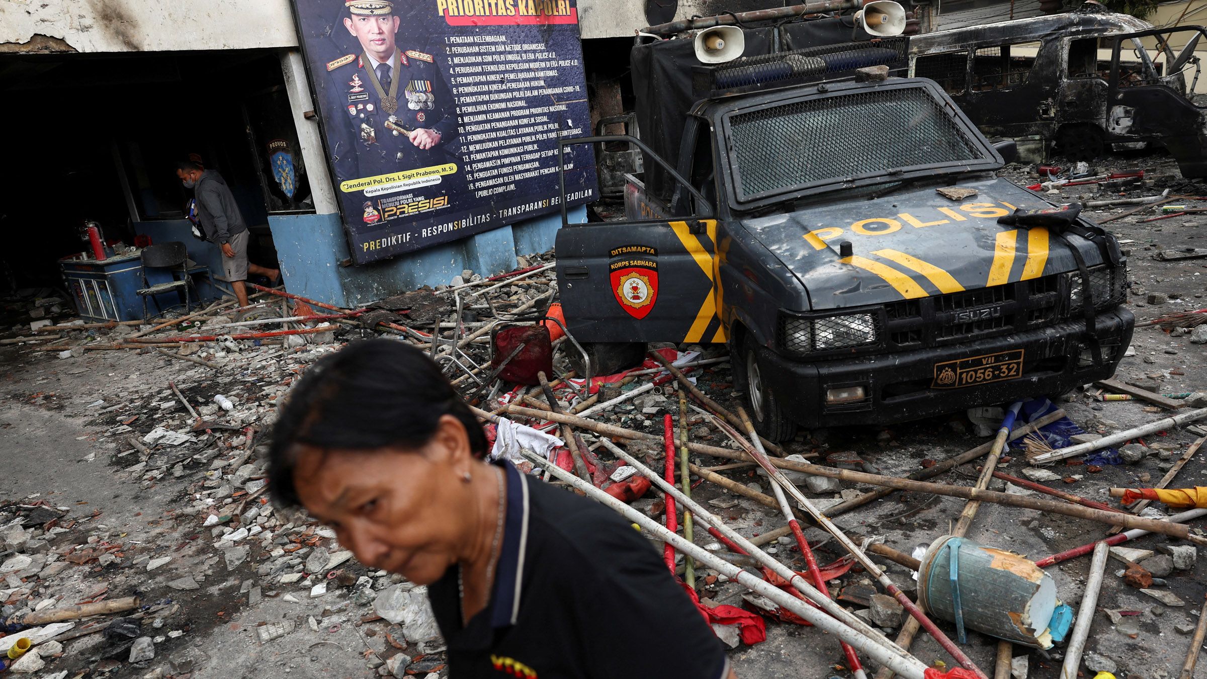 A woman walks past a damaged vehicle at East Jakarta's police headquarters. (Photo by Willy Kurniawan/Reuters)
