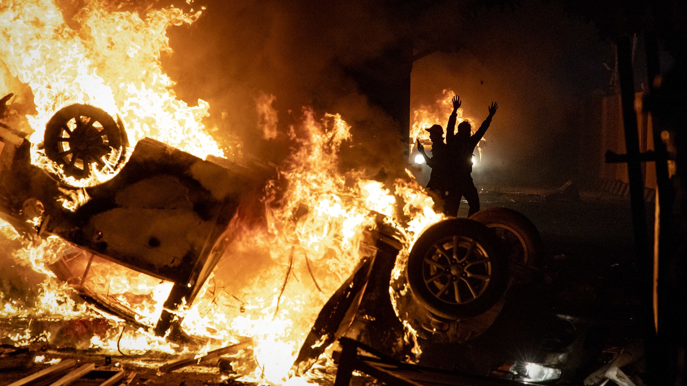 Vehicles burn during a protest at police headquarters in Yogyakarta. (Photo by Ulet Ifansasti/Getty Images)