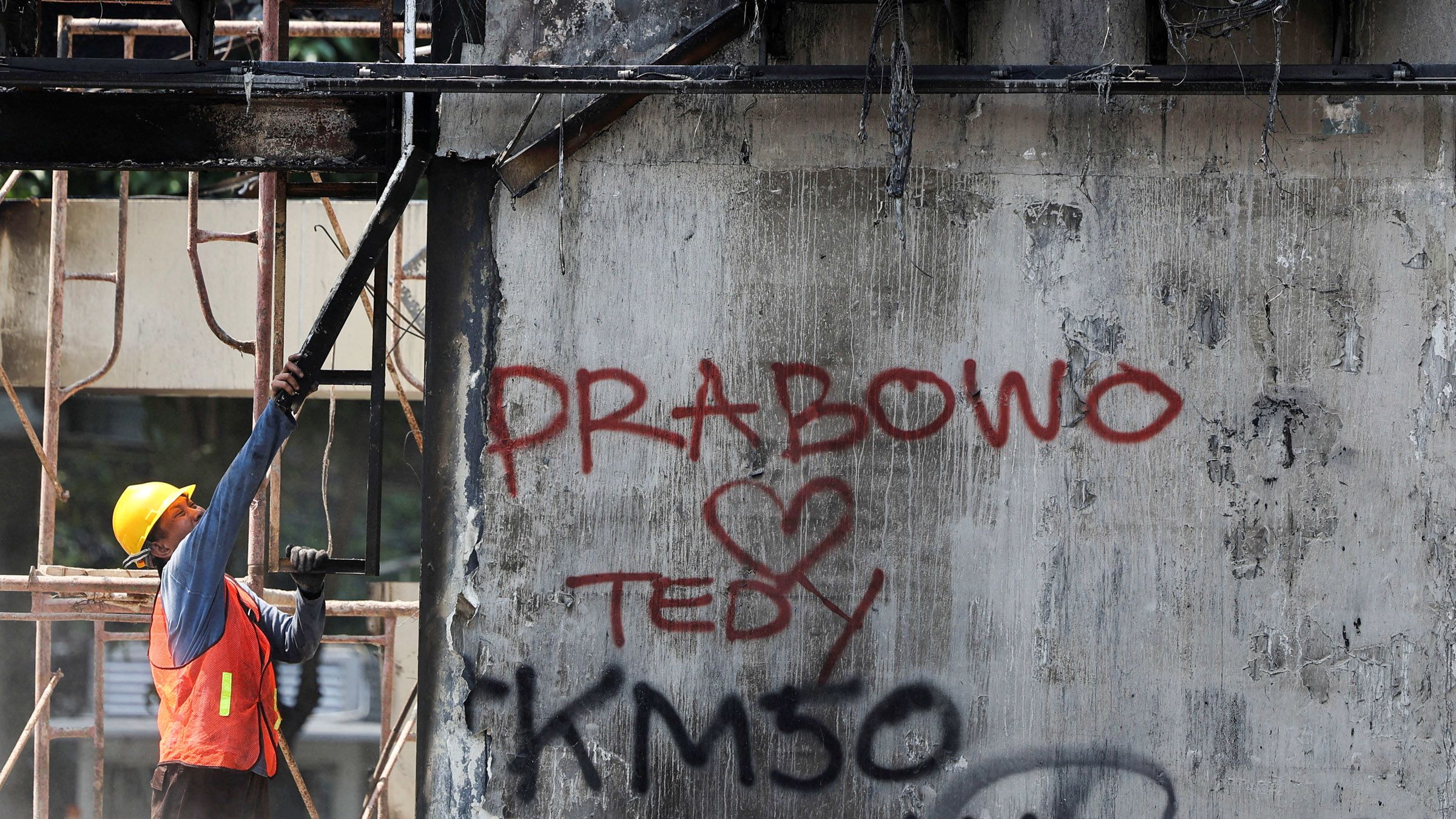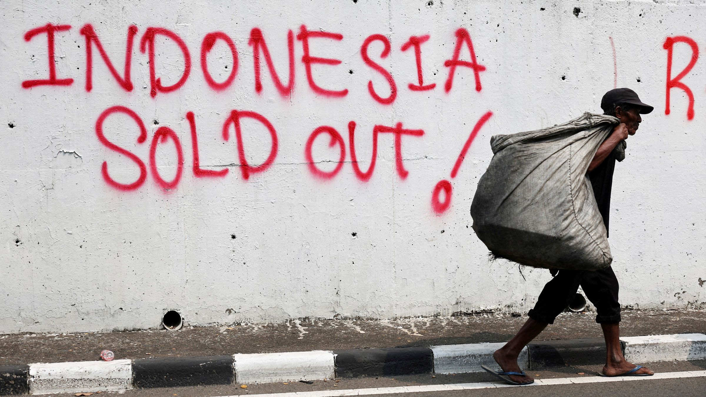 A man walks past graffiti during a protest outside parliament in Jakarta. (Photo by Willy Kurniawan/Reuters)
