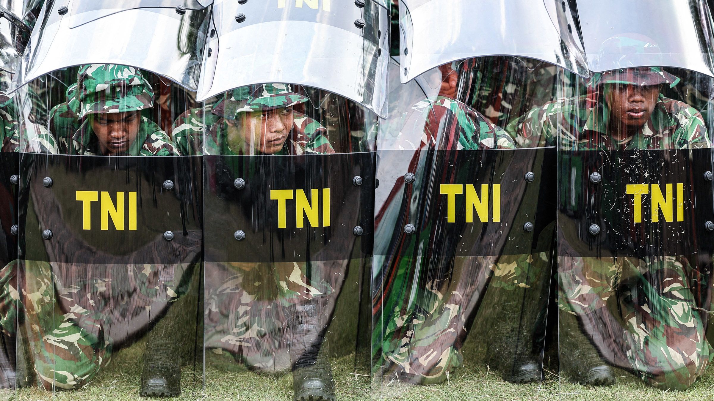 On Sept. 1, armed military troops attend an anti-riot practice at the National Monument complex in Jakarta. (Photo by Willy Kurniawan/Reuters)