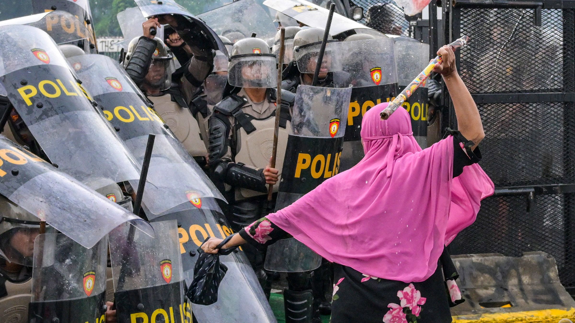 A woman strikes a shield with a bamboo rod as police push back against students in Jakarta. Pink and green have become symbols of solidarity among protesters. (Photo by Bay Ismoyo/AFP/Jiji)