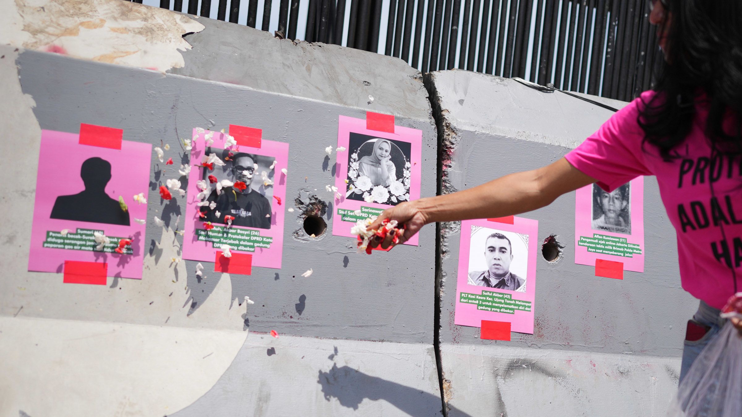 An activist at a rally in Jakarta sprinkles flowers on photos of people who have been killed during the protests. (Photo by Dita Alangkara/AP)