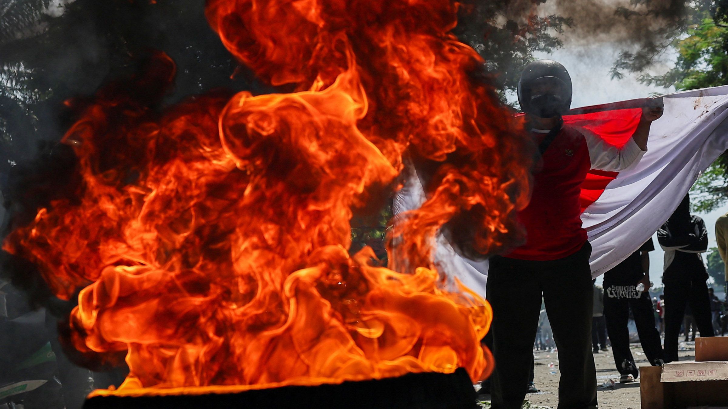 On Aug. 29, a demonstrator carrying an Indonesian flag stands near burning tires outside the headquarters of the Jakarta Mobile Brigade. Protests widened after a motorcycle taxi driver died from being struck and run over by a police tactical vehicle a day earlier. (Photo by Willy Kurniawan/Reuters)
