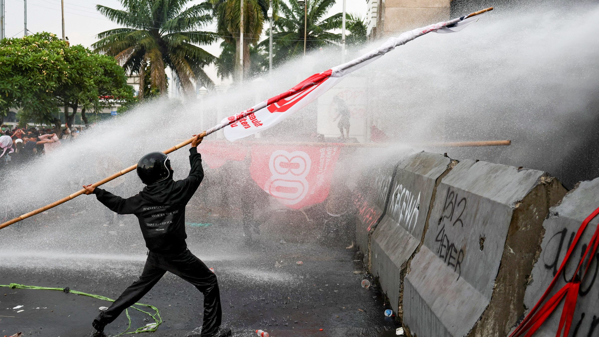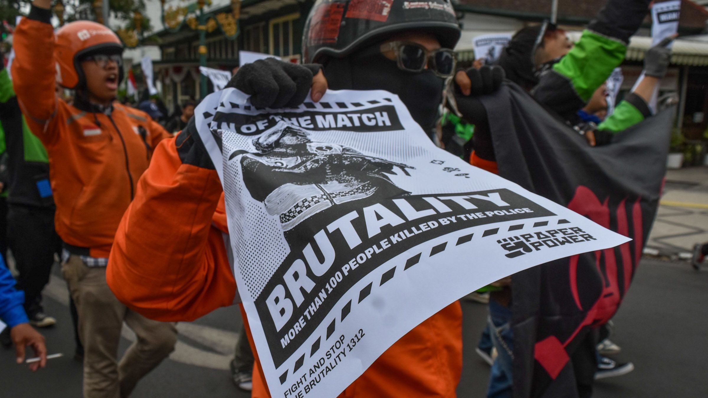 A demonstration unfolds in front of the Metro Jaya Regional Police Headquarters in Jakarta. The students and other members of the general public present at the protest were demanding justice for the motorcycle taxi driver. (Photo by Claudio Pramana/Getty Images)
