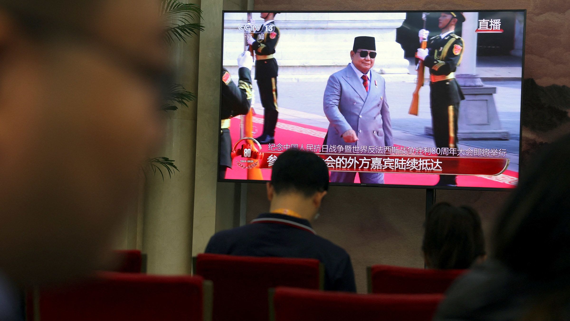 On Sept. 3, a TV screen shows Indonesian President Prabowo Subianto arriving for a military parade marking the 80th anniversary of the end of World War II, in Beijing. (Photo by Florence Lo/Reuters)