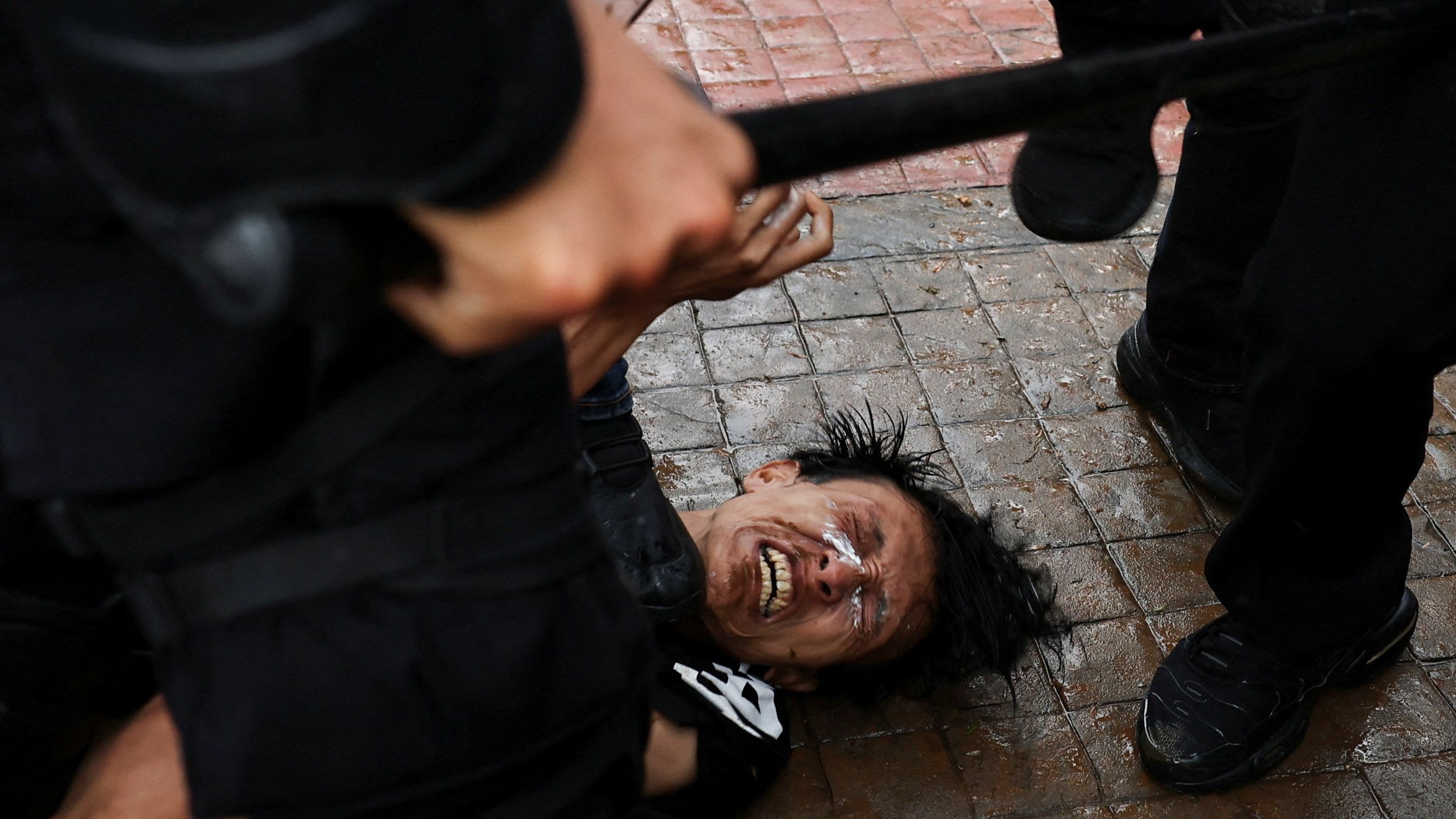 A man is pressed to the ground by police officers during a clash outside parliament. (Photo by Willy Kurniawan/Reuters)
