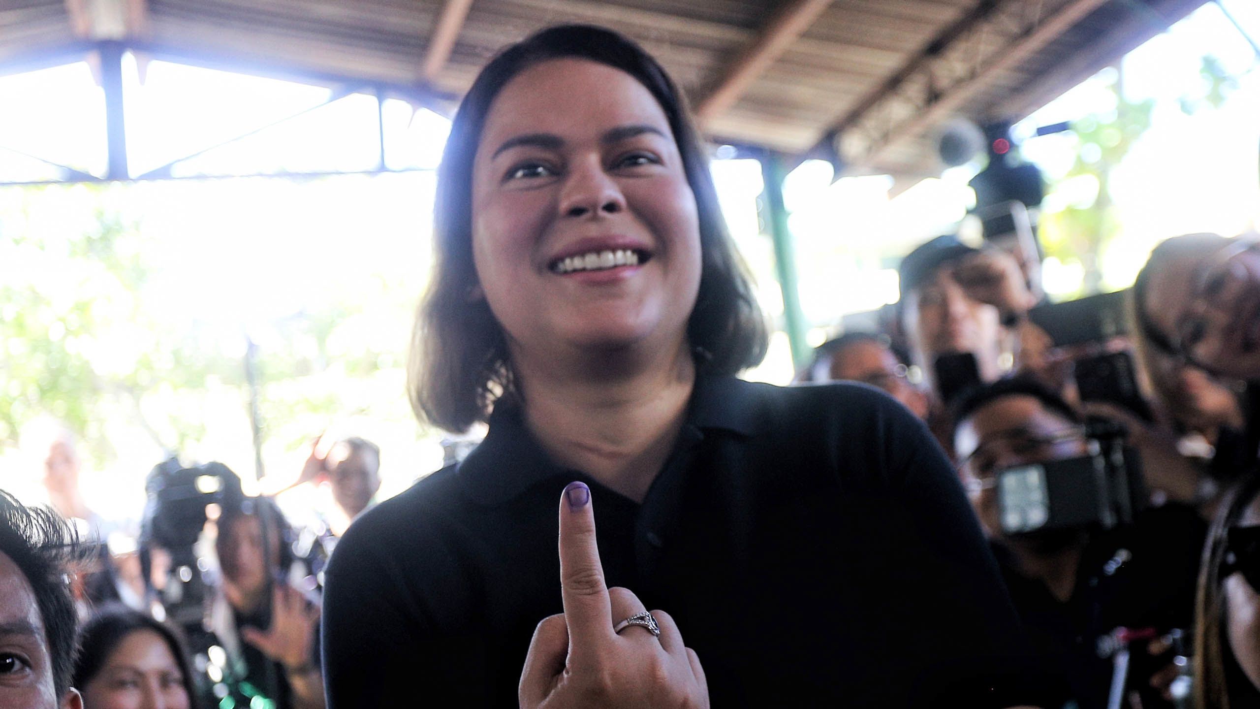 Vice President Sara Duterte shows the indelible ink on her finger after casting her vote at a polling center in Davao City on May 12. (AP Photo/Manman Dejeto)