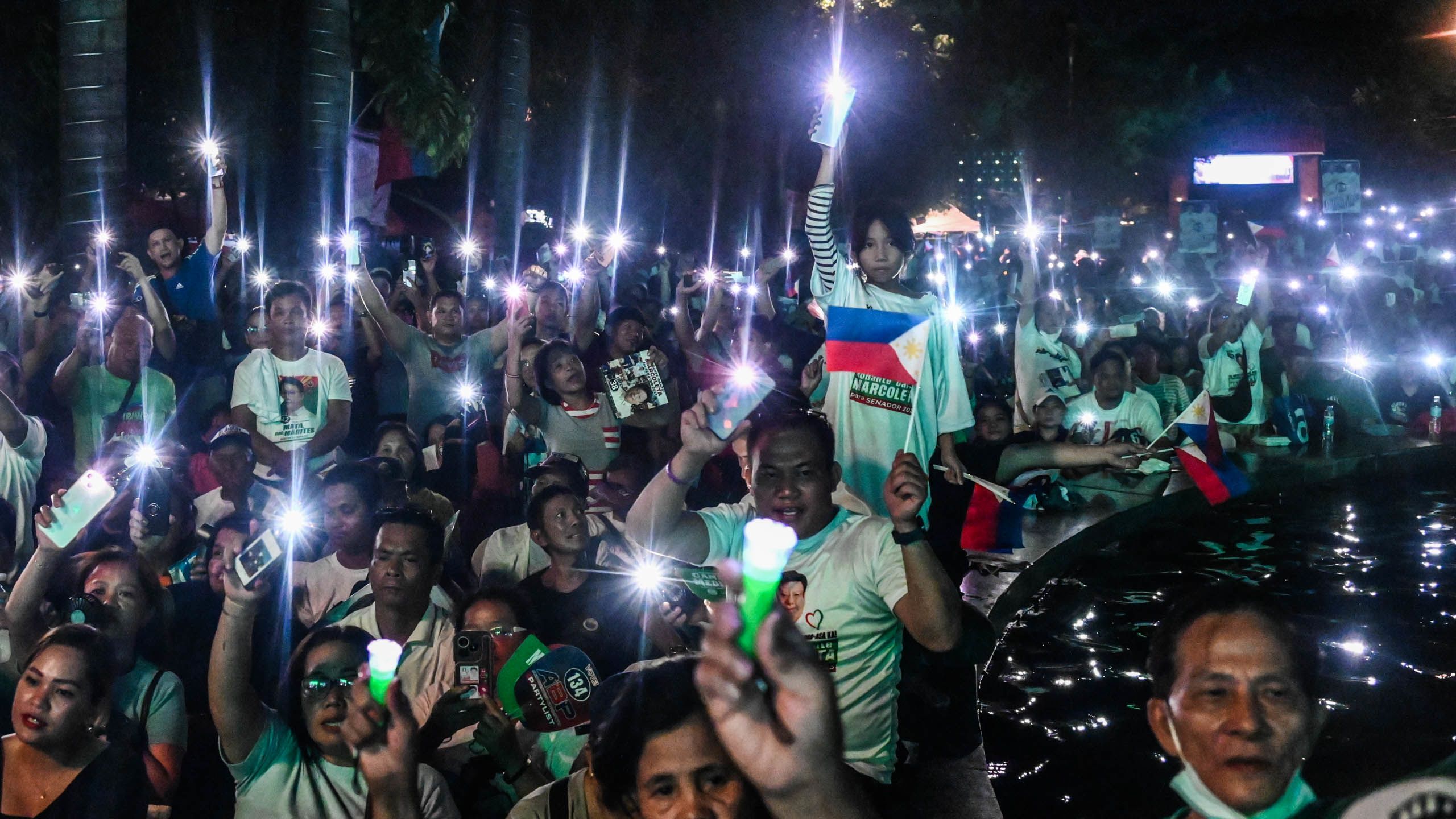 Supporters of Vice President Sara Duterte shine lights from their mobile phones during a campaign event in Manila on May 8. (Photo by Suzu Takahashi)