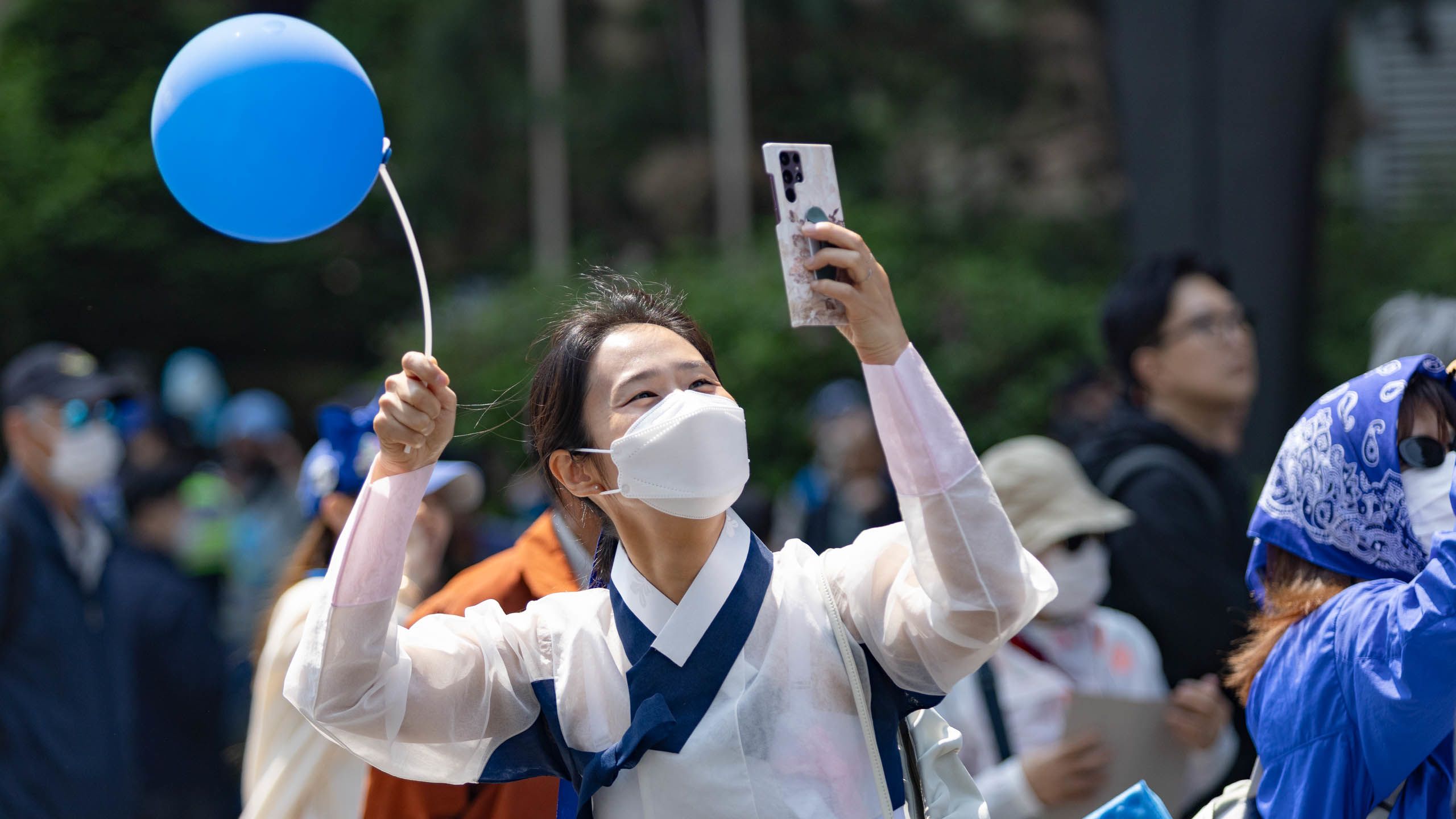 Lee Jae-myung, the Democratic Party's presidential candidate, steps down from the stage after delivering his first campaign speech during the party's central election committee kickoff rally at Cheonggye Plaza in Seoul on May 12, marking the first official day of campaigning for the June 3 presidential election. A supporter in traditional hanbok dress records the moment on video. (Photo by Chris Jung/Getty Images)