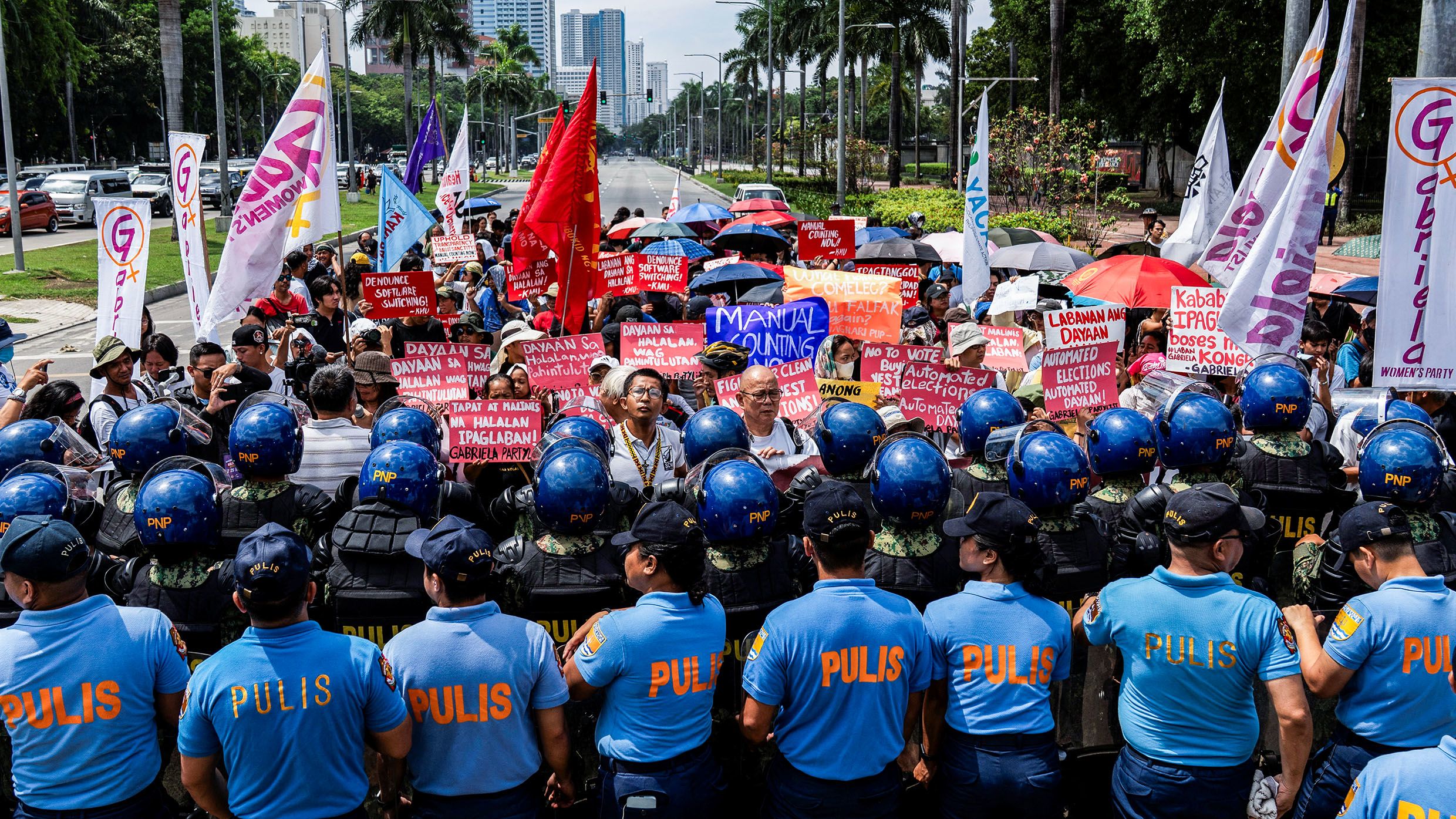 Police officers block marchers during a demonstration on May 13 in Manila calling for fair elections, a day after the midterm elections. (Photo by Lisa Marie David/Reuters)