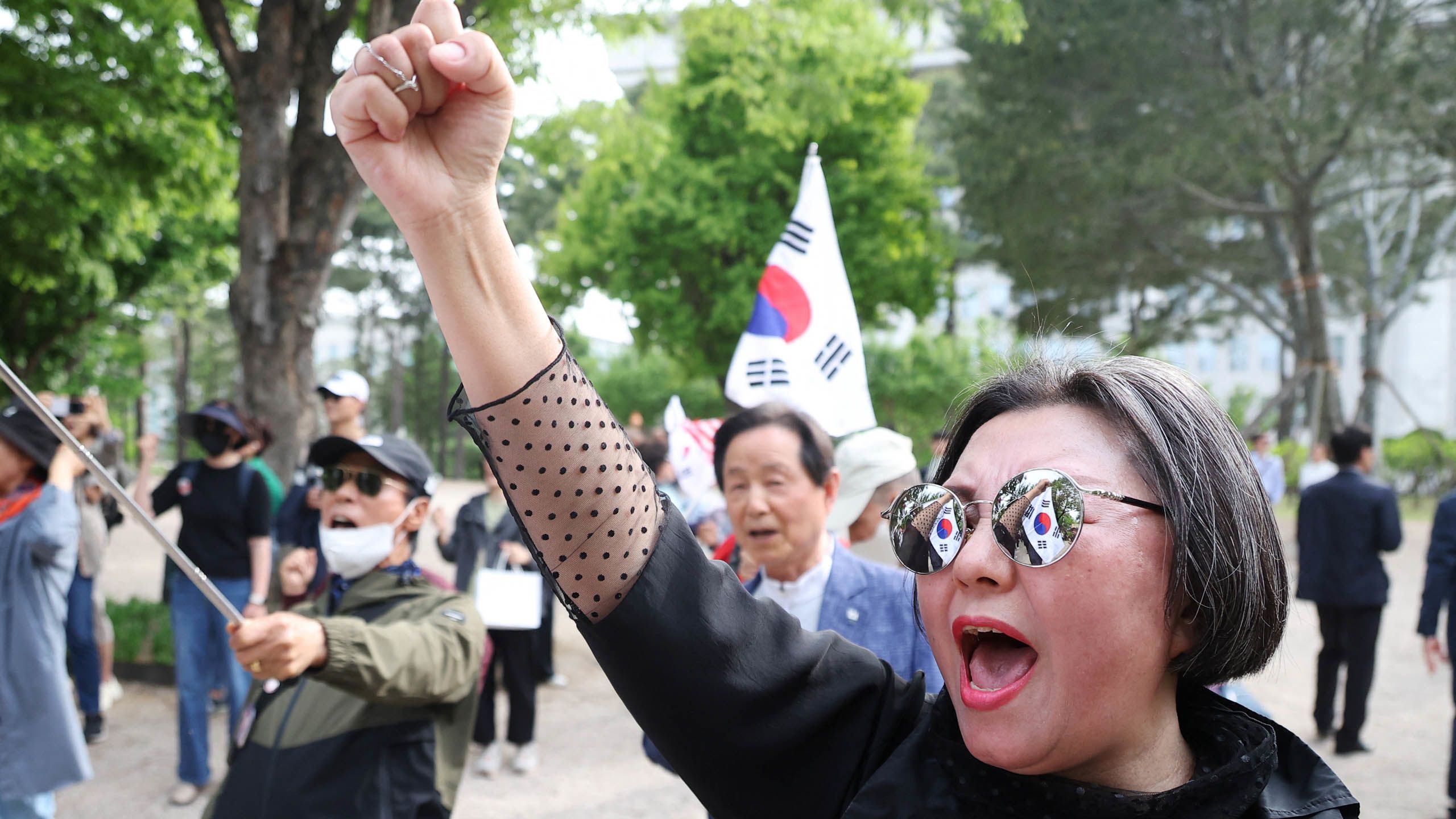Supporters of Kim Moon-soo, presidential candidate of the conservative People Power Party, cheer as Kim meets former Prime Minister Han Duck-soo in Seoul on May 8 to discuss strategy. (Photo by Kim Hong-Ji/Reuteres)