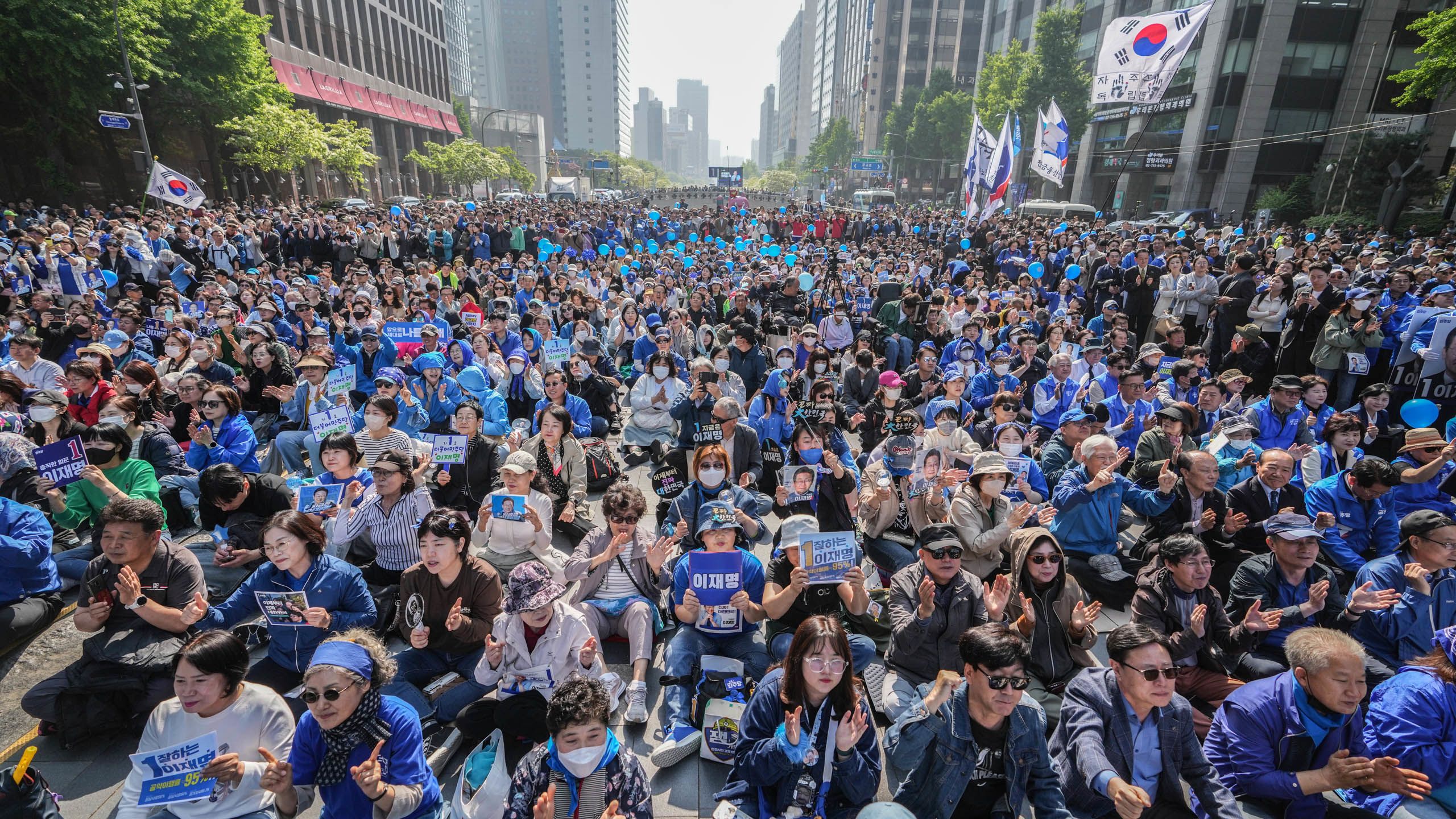 Supporters of Lee Jae-myung, presidential candidate of the Democratic Party, pose for photographs during an election rally in Seoul on May 12. (Photo by Kim Hong-Ji/Reuters)