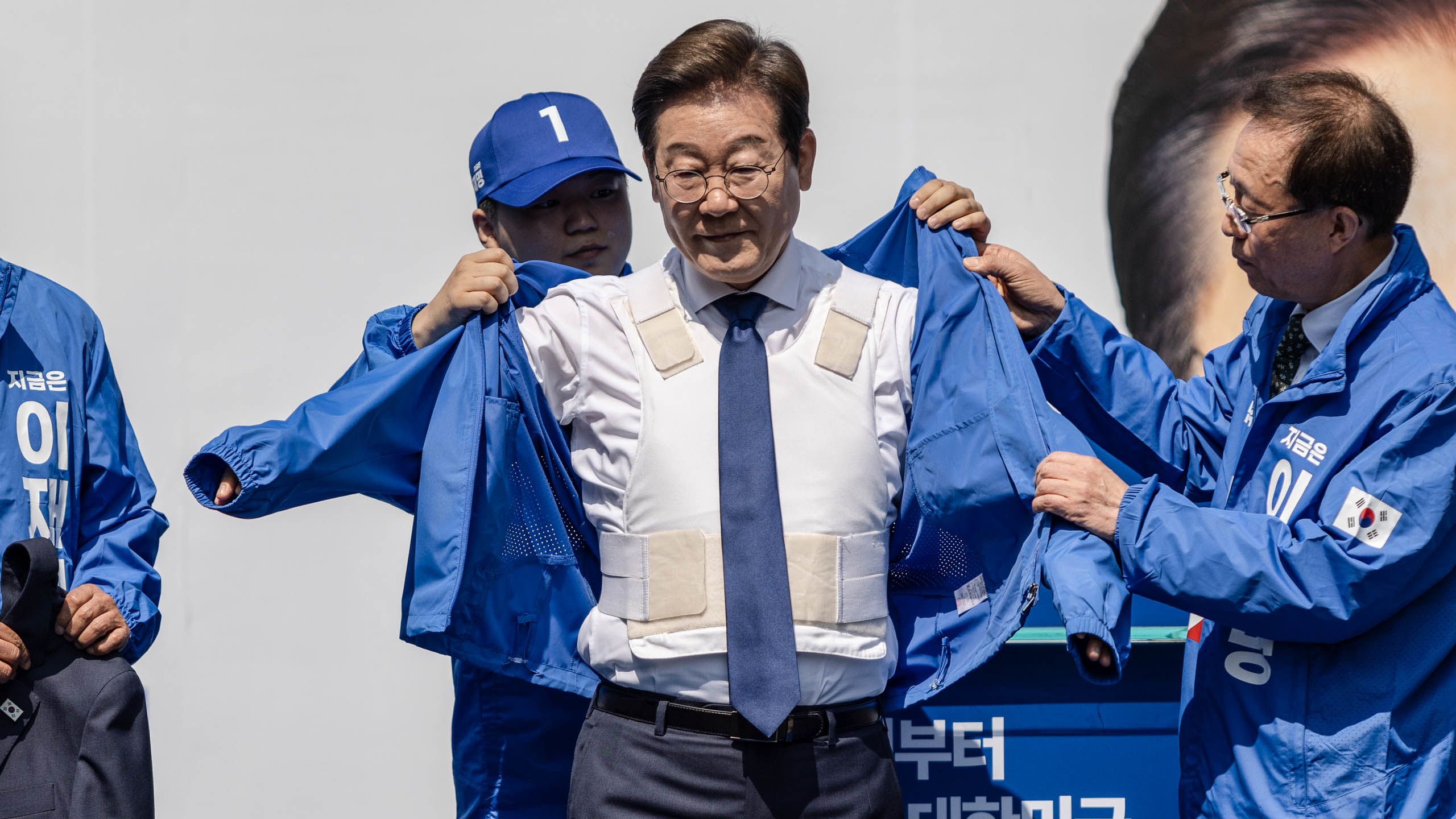 Lee Jae-myung, presidential candidate of the Democratic Party, puts on a campaign vest over a bulletproof vest during the official kickoff rally for the June 3 presidential election at Cheonggye Plaza in Seoul on May 12. Following intelligence reports of a possible attack after the Dec. 3 martial law declaration, the party has had Lee wear knife-resistant gear, but this was his first public appearance in a bulletproof vest on the official campaign trail. (Photo by Chris Jung/Getty Images)