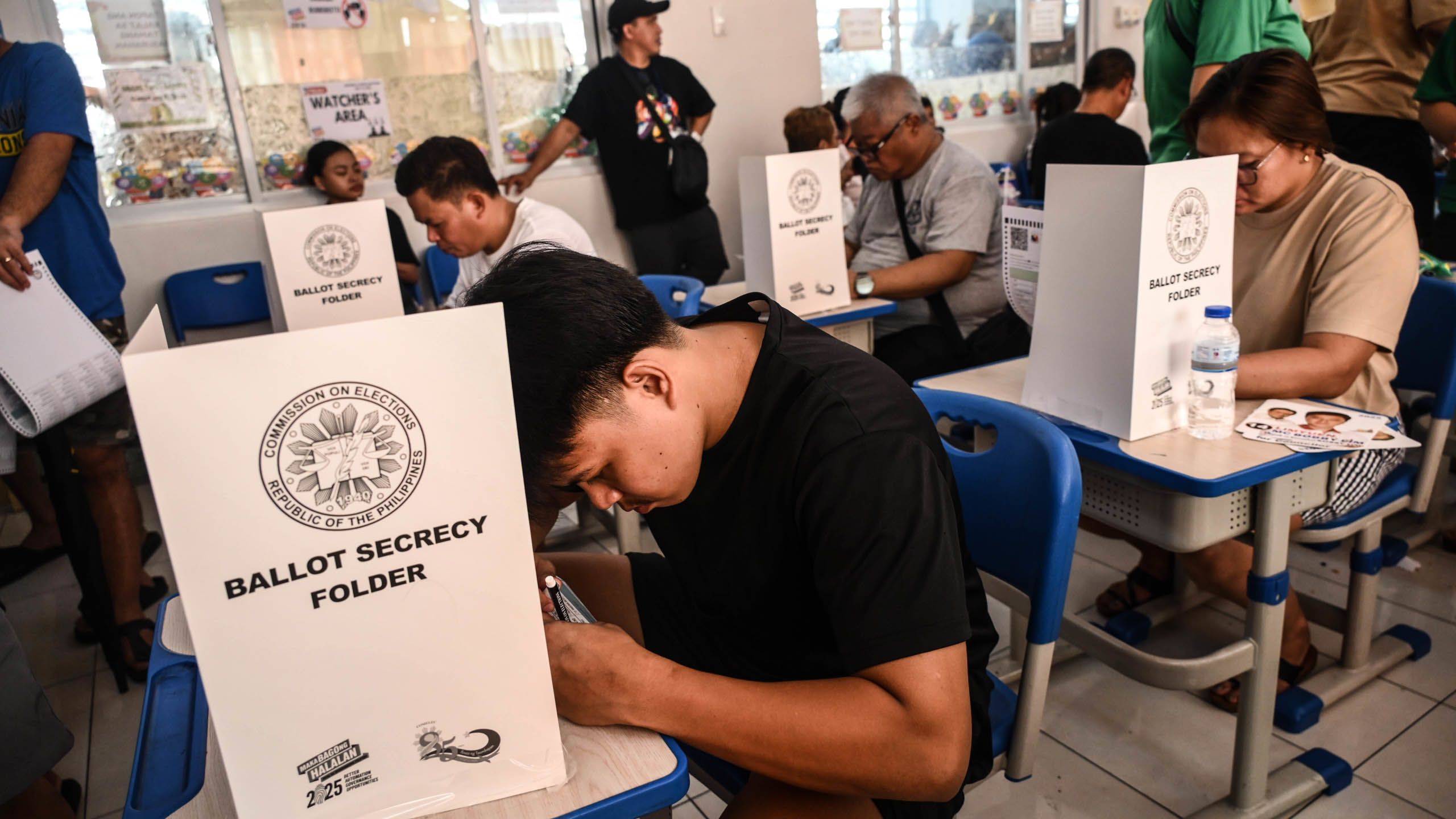 Voters fill out ballots at a polling station in Metro Manila on May 12, with little to keep their choices secret apart from a folder. (Photo by Suzu Takahashi)