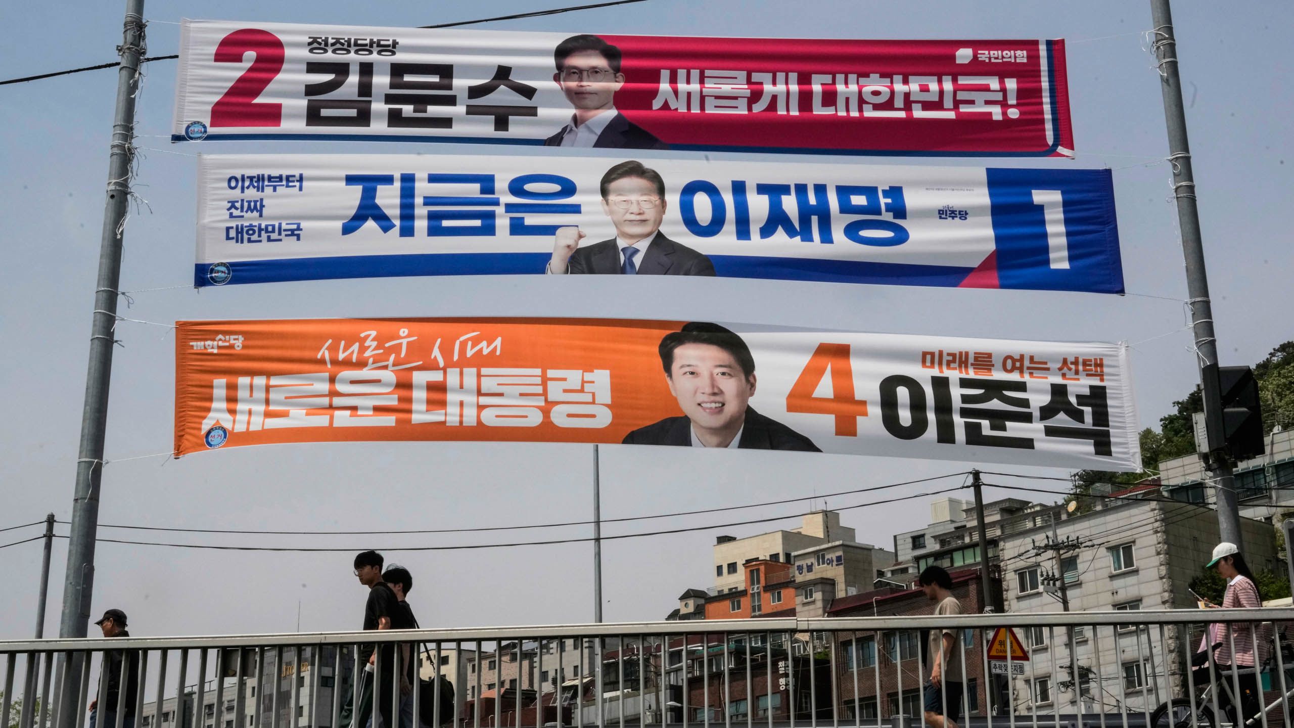Banners of presidential candidates Kim Moon-soo of the People Power Party, top, Lee Jae-myung of the Democratic Party, center, and Lee Jun-seok of the New Reform Party are displayed on a Seoul street on May 13, ahead of the June 3 election. (Photo by Ahn Young-joon/AP)
