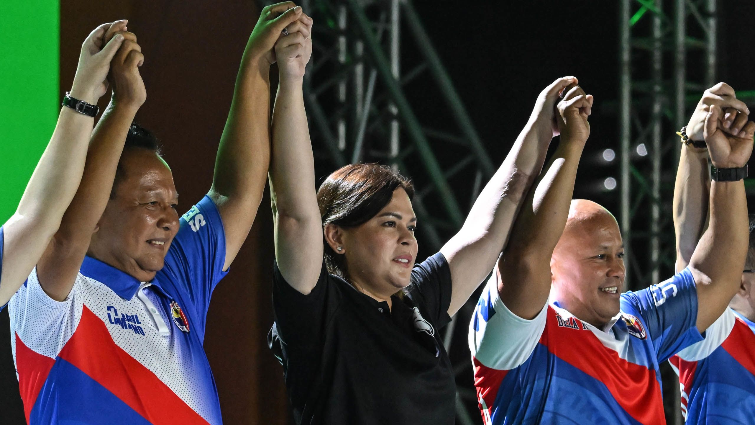 Philippine Vice President Sara Duterte, second from left, raises her arms during a Partido Demokratiko ng Pilipinas (“democratic party of the Philippines”) rally in Manila on May 8. The elections come at a turbulent time in domestic politics. Experts see the vote as a proxy battle between the feuding Marcos and Duterte families. (Photo by Suzu Takahashi)