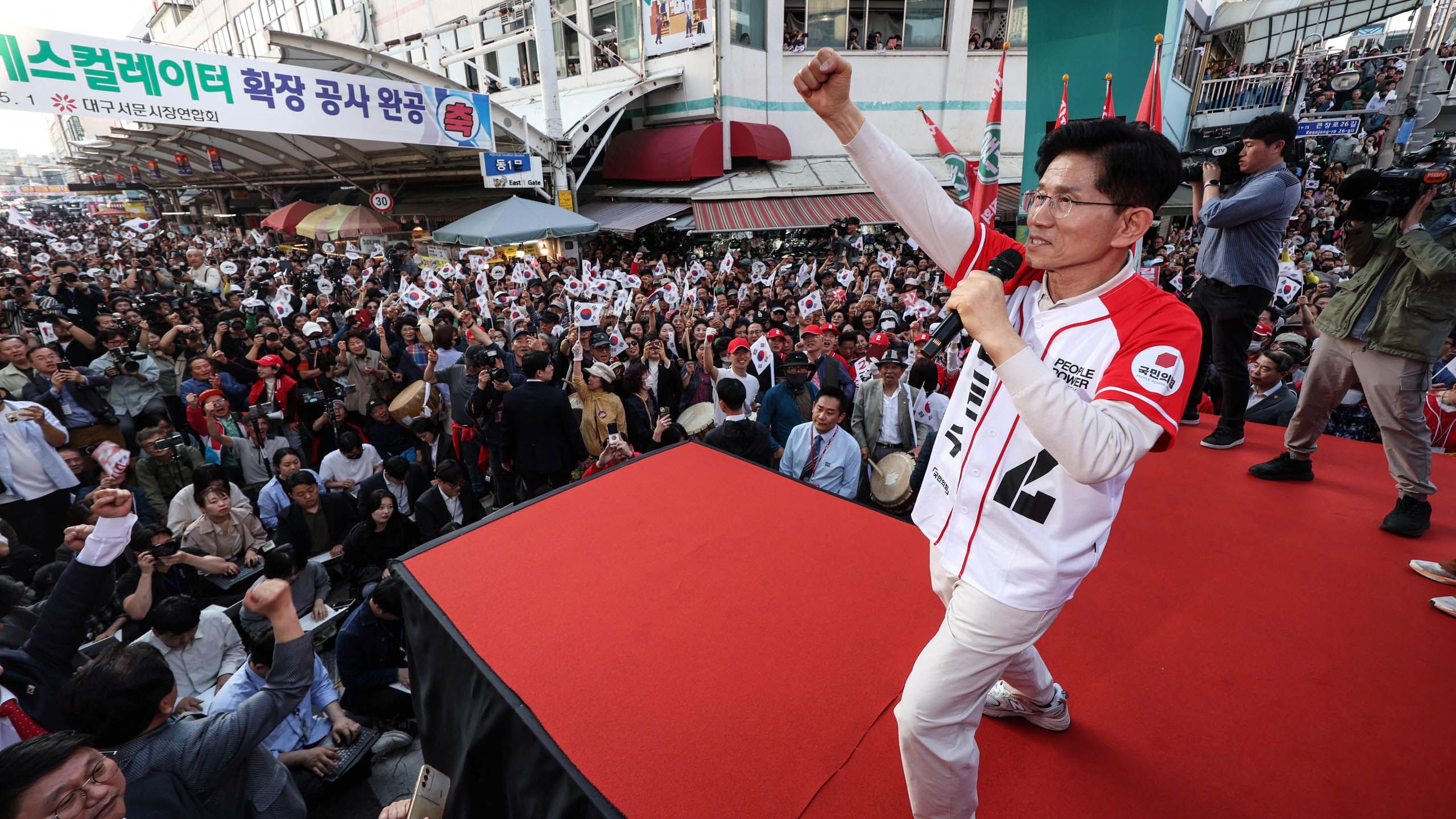 Kim Moon-soo, presidential candidate of the conservative People Power Party, appears at a campaign rally at a traditional market in Daegu, South Korea, on May 12, two months after the Constitutional Court upheld the National Assembly's impeachment of President Yoon Suk Yeol. The vote to replace him will take place June 3. (Photo by Yonhap/Reuters)