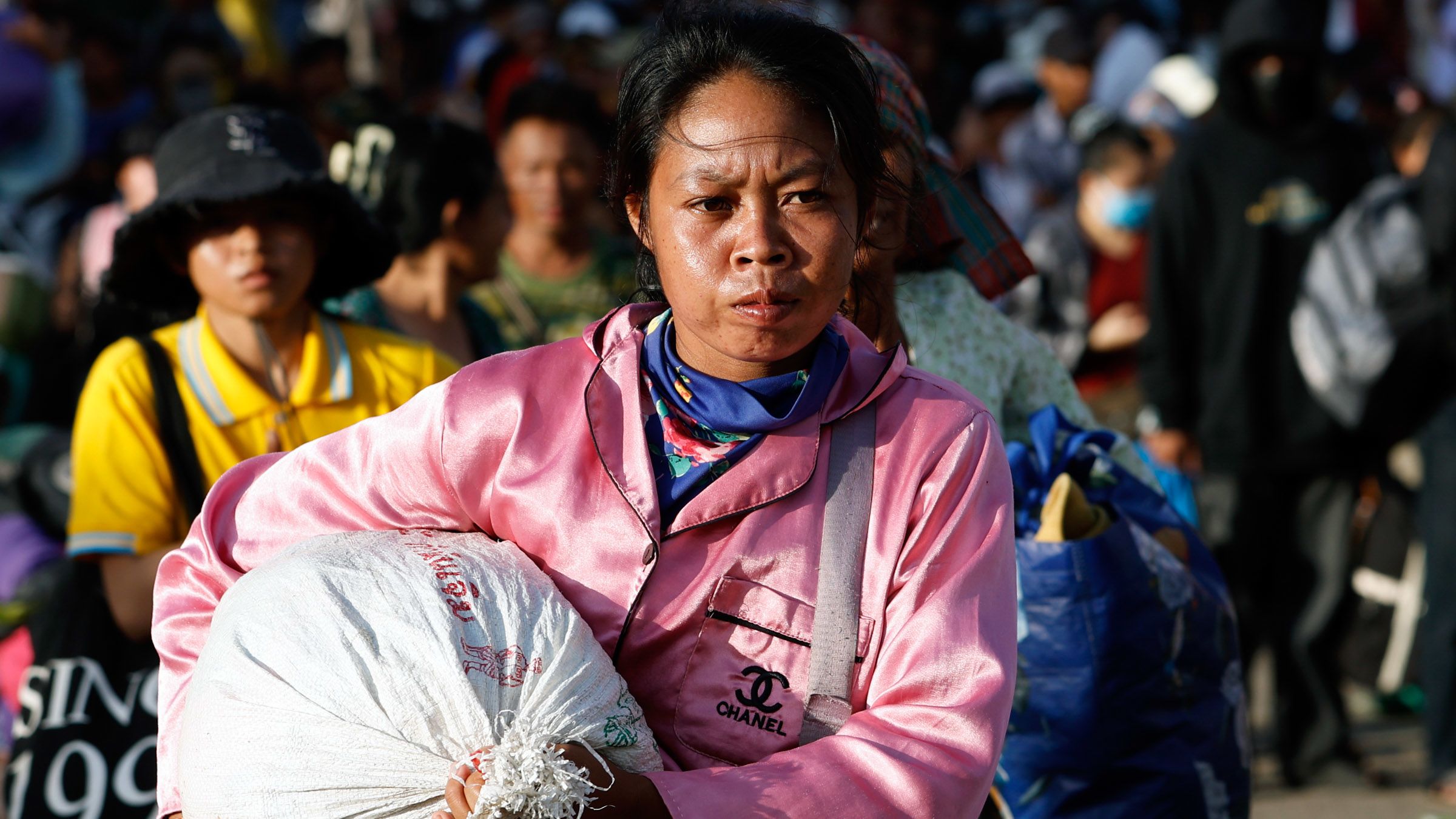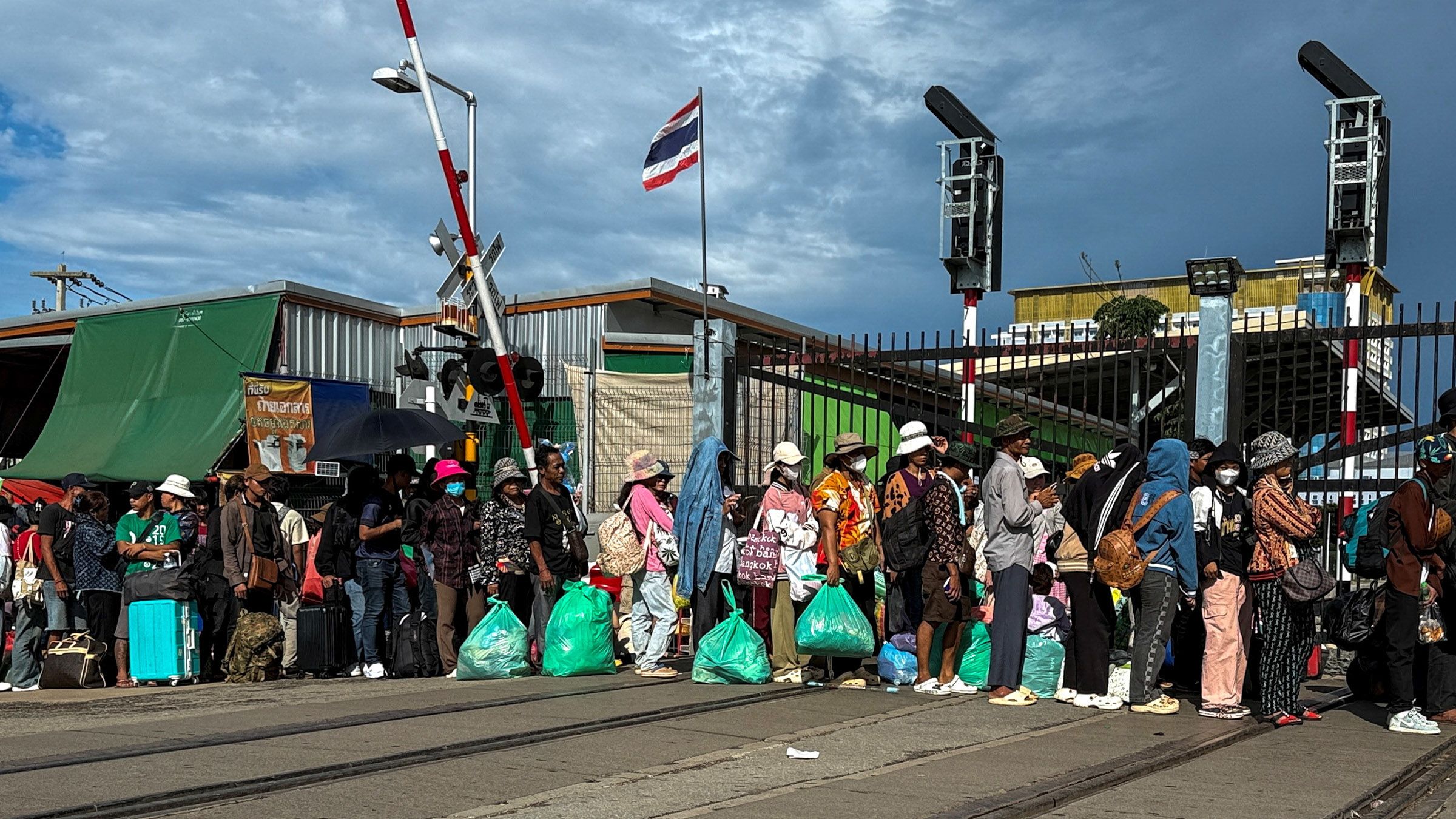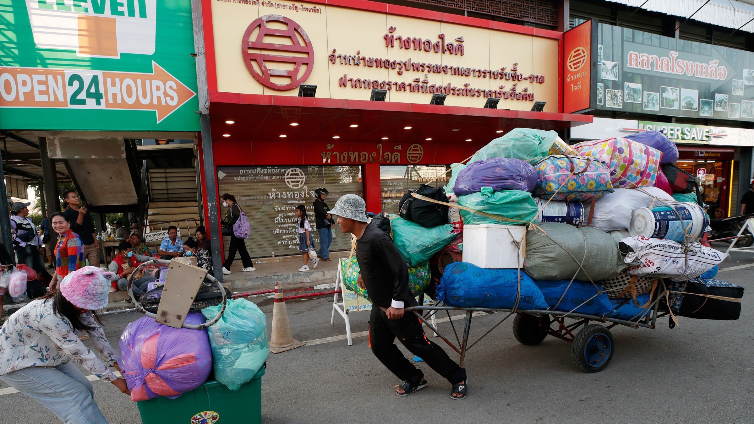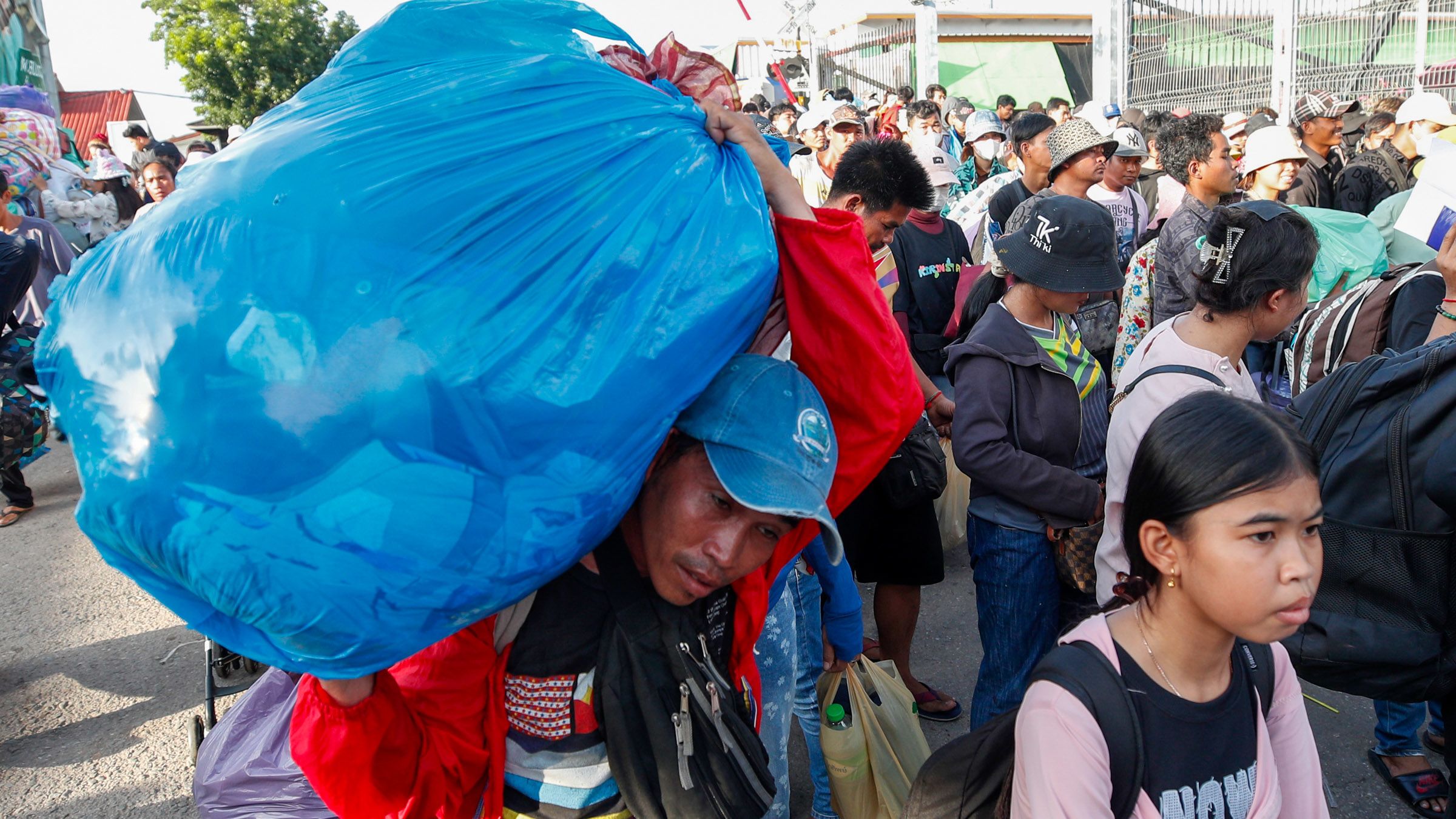 Cambodians carrying their belongings prepare to cross the border to Cambodia during a temporary opening that enabled stranded Thais to come the other way. The Ban Khlong Luk border checkpoint in Aranyaprathet district, Sa Kaeo province, and other crossing points were closed by the Thai military following a border spat. This was presented by the Thai army as part of a broader crackdown on multiple transnational scam centers operating along the border. (Photo by Rungroj Yongrait/EPA/Jiji)