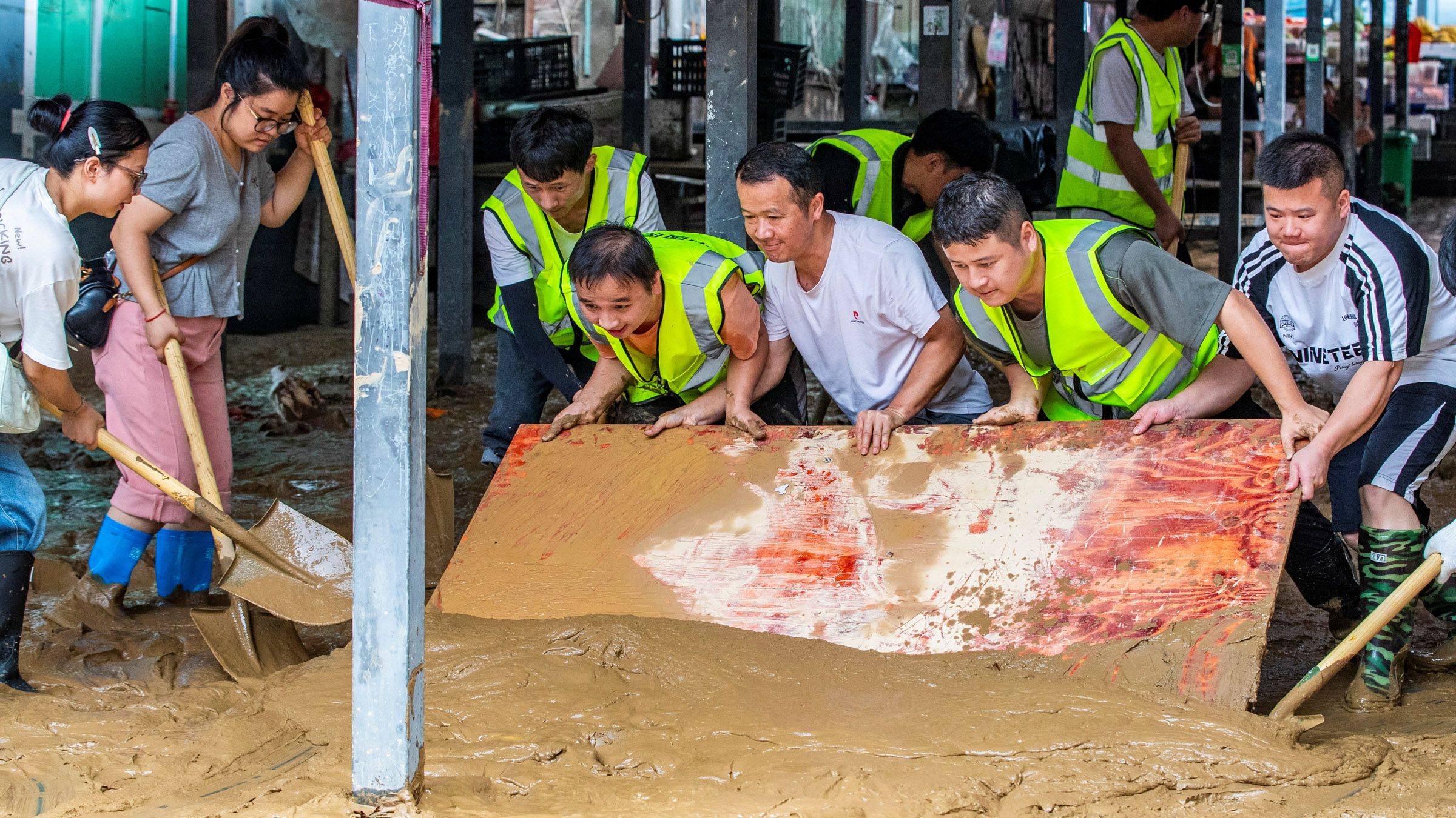 Residents clear away mud after a flood in Congjiang county, Qiandongnan Miao and Dong Autonomous prefecture, Guizhou province, on June 25. (Photo by CNS/Reuters)