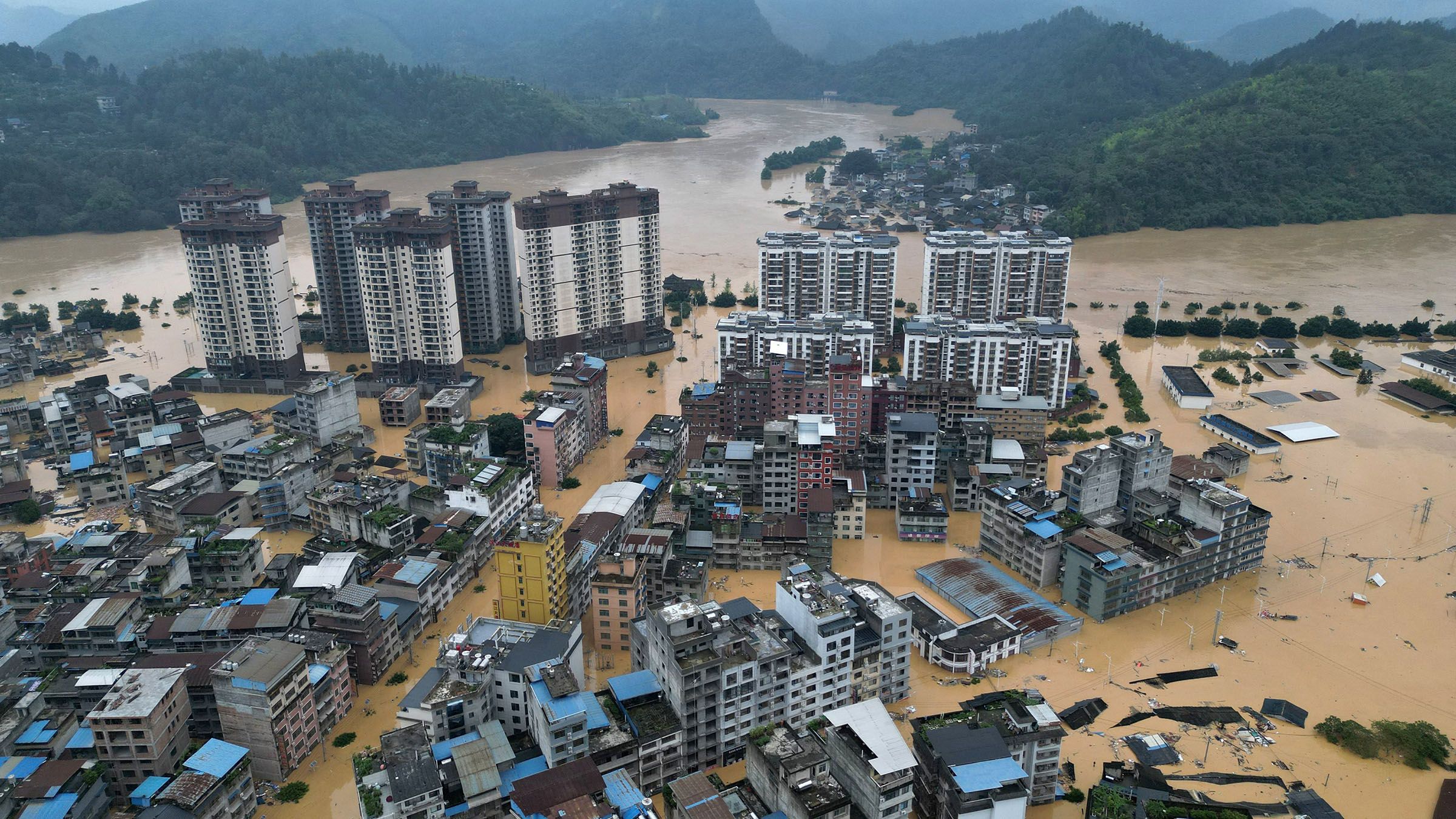 Flooded buildings in Rongjiang in China’s Guizhou province on June 24. (Photo by AFP/Jiji)