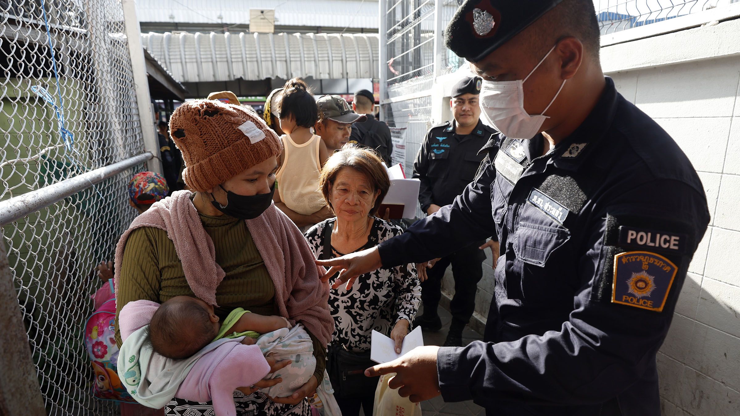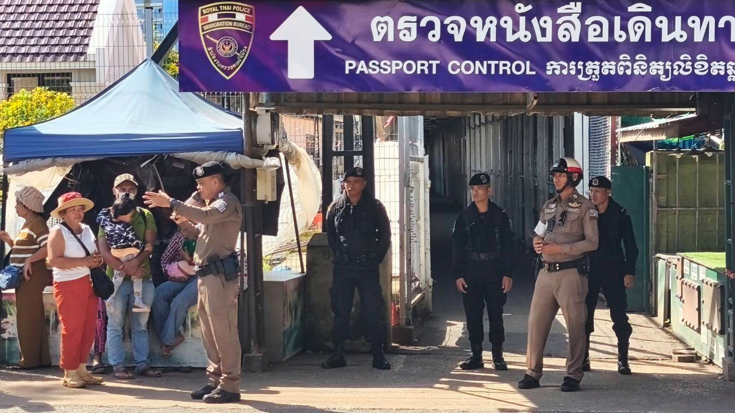 Thai police officers talk to people near a border checkpoint between Thailand and Cambodia, in Sa Kaeo province on June 24. (Photo by Royal Thai Army/AP)
