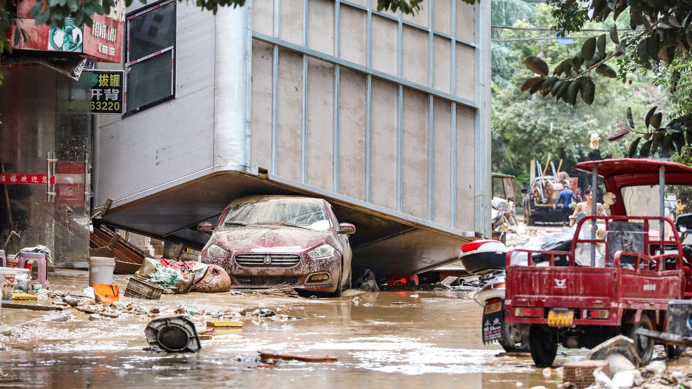 A debris-strewn street after floodwaters receded in Rongjiang county on June 25. (Photo by CNS/Reuters)