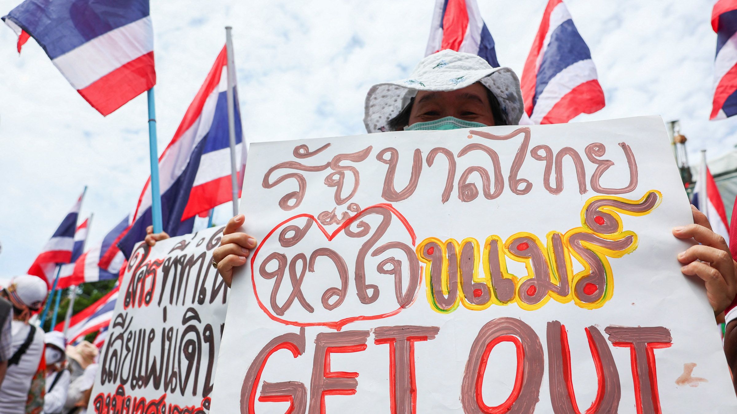 A royalist activist holds a placard that reads "Thai government with Khmer heart Get Out" during an anti-government protest, following a leak of a phone call between Thailand's Prime Minister Paetongtarn Shinawatra and Cambodia's Hun Sen near the Government House, in Bangkok on June 19. (Photo by Chalinee Thirasupa/Reuters)