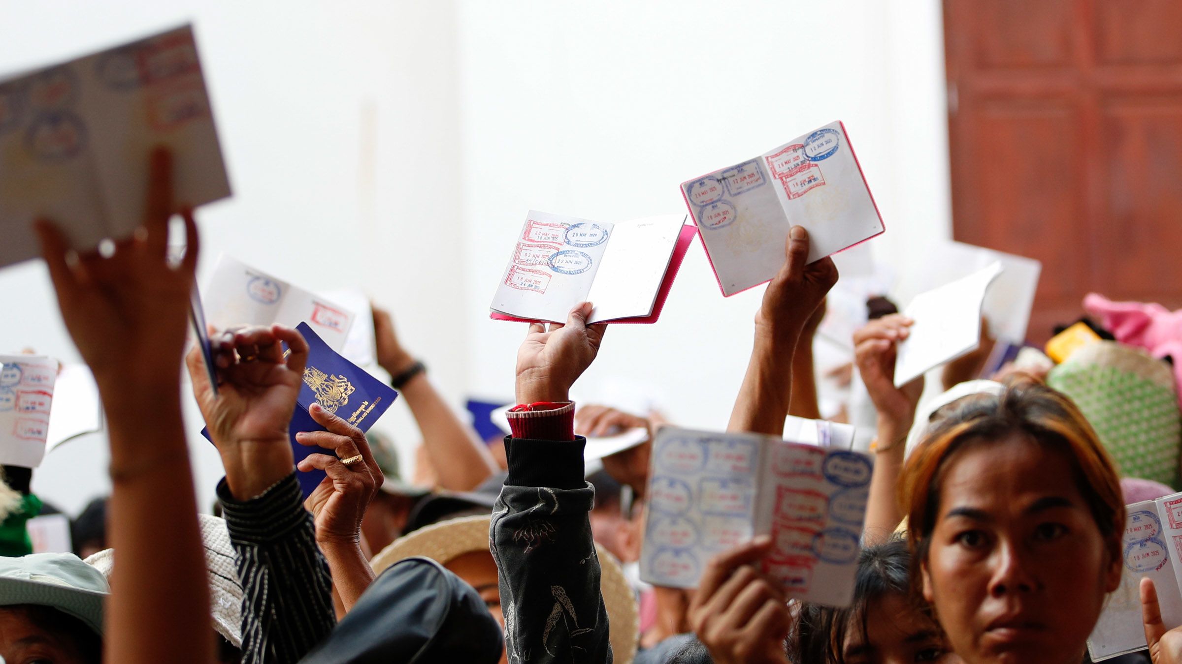 Cambodians wave travel documents at the Ban Khlong Luek border checkpoint. (Photo by Rungroj Yongrit/EPA/Jiji)
