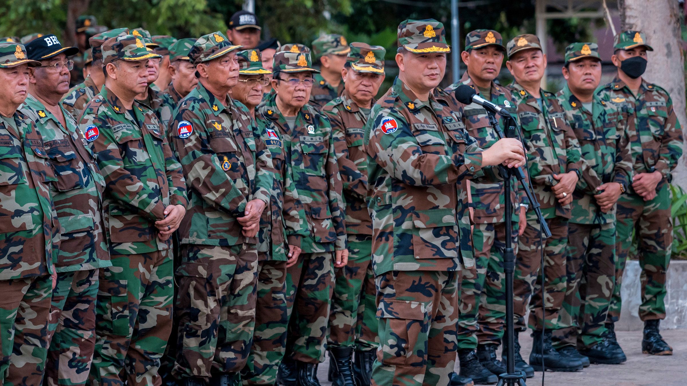 Cambodian Prime Minister Hun Manet, foreground, delivers a speech in front of his troop during his visit to Preah Vihear, near Cambodia-Thailand border in Preah Vihear province, Cambodia, on June 23. (Photo by AKP/AP)