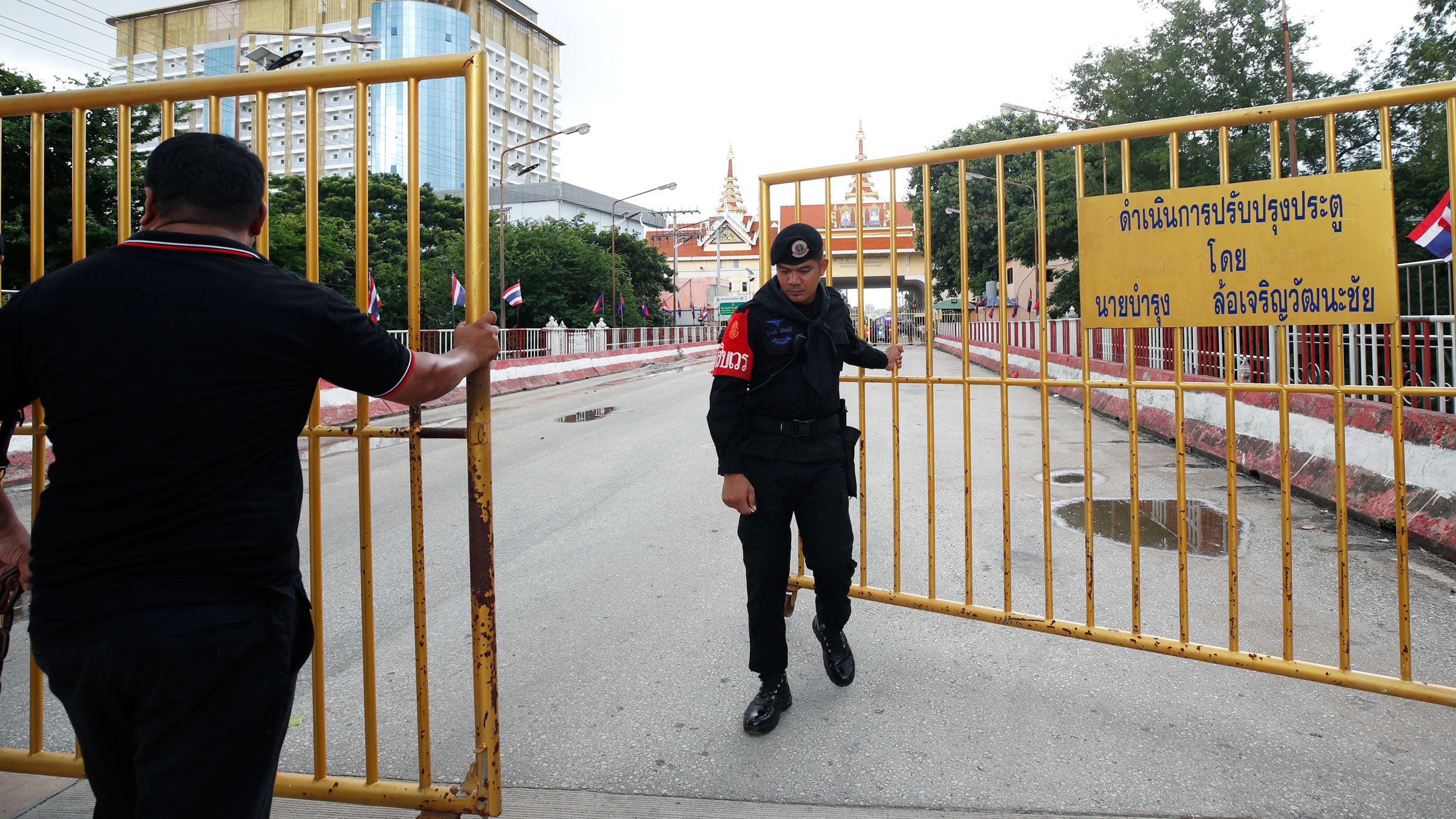 Thai paramilitary personnel at Ban Khlong Luek checkpoint on June 24 during the Thailand-Cambodia border closure. (Photo by Rungroj Yongrit/EPA/Jiji)