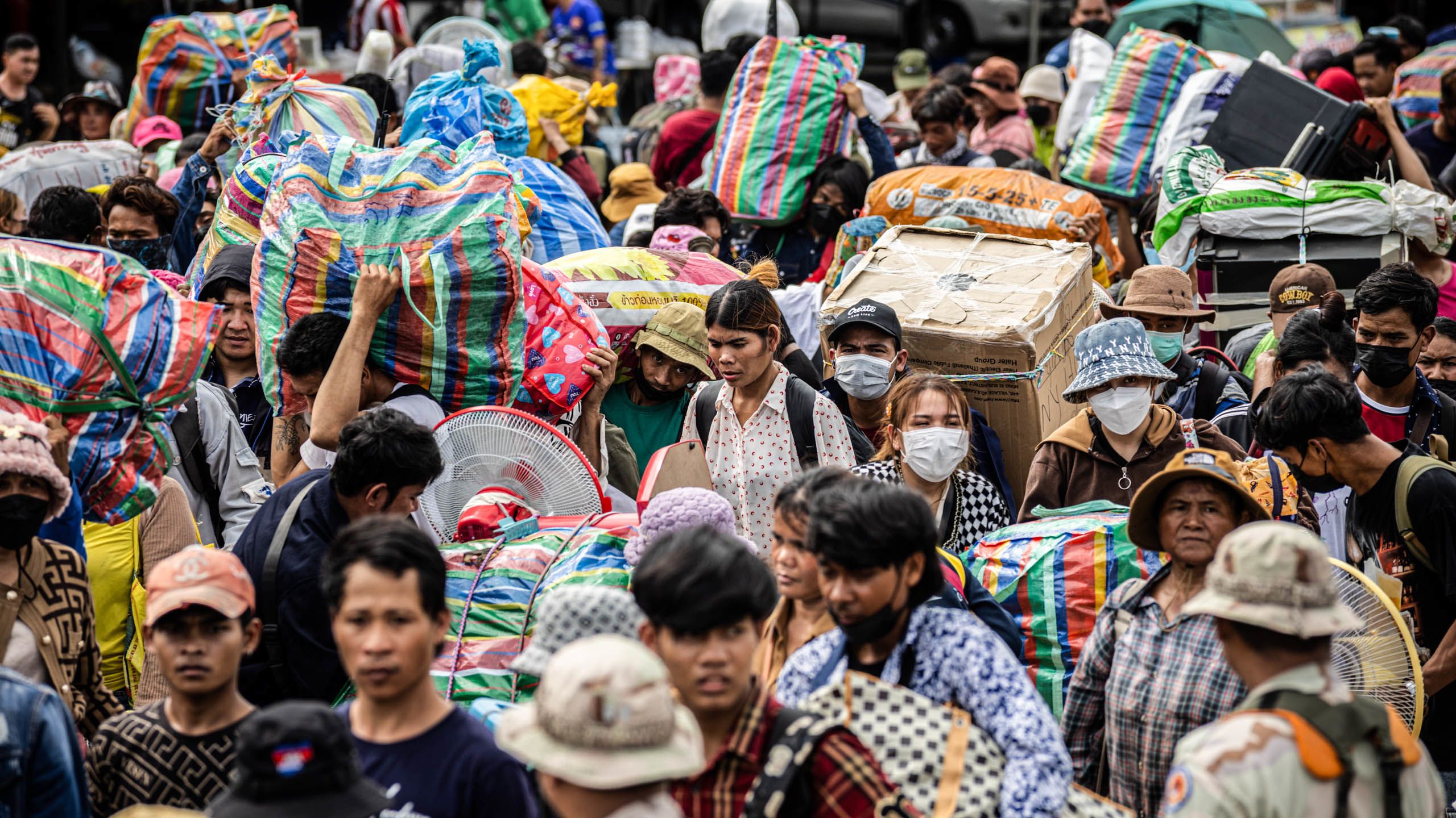 Cambodian migrant workers carry their belongings across the Ban Laem border checkpoint on July 29, 2025, in Chanthaburi, Thailand, a day after the combatants agreed to a ceasefire in a clash that to that point had left at least 35 dead and over 200,000 displaced. (Photo by Lauren DeCicca/Getty Images)