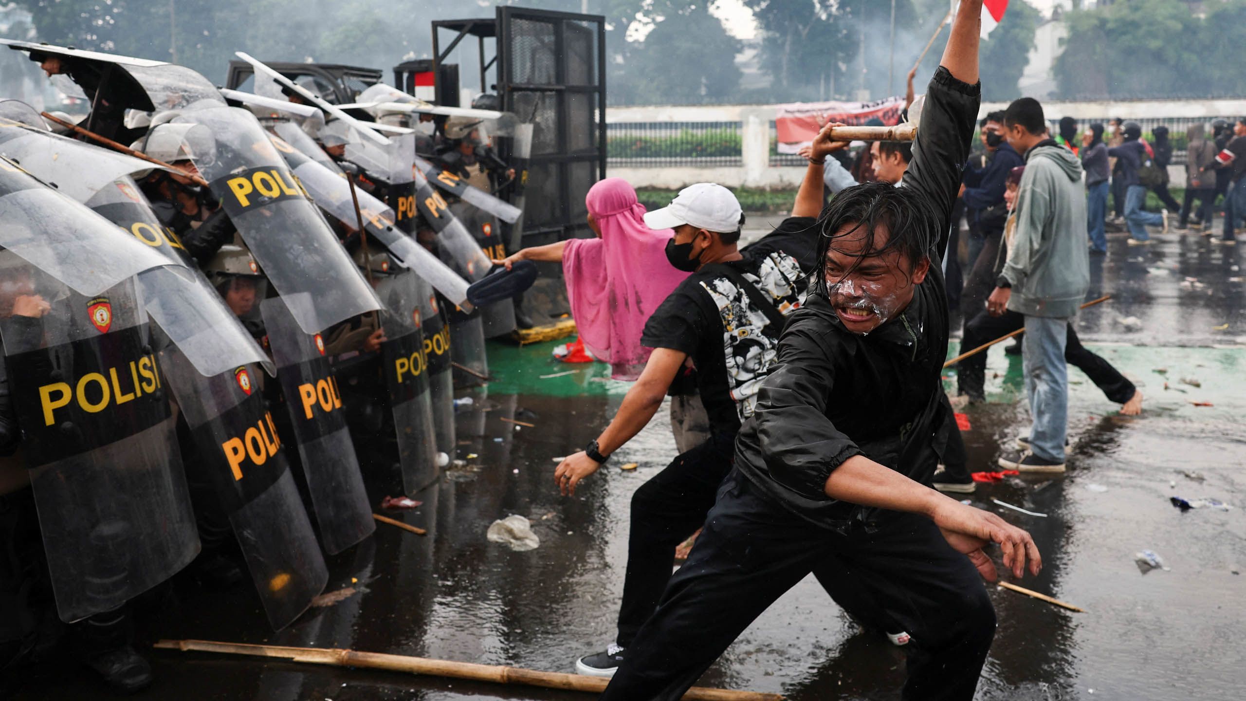 Demonstrators clash with riot police at a protest against what the demonstrators said were exorbitant allowances for Indonesian parliamentarians, outside Indonesian parliament buildings in Jakarta on Aug. 28. The wave of protests across Indonesia left at least seven people dead. The damage to government facilities, including police headquarters and legislative offices, was widespread. Observers said the violent unrest reflected frustration over economic hardship. (Photo by Willy Kurniawan/Reuters)